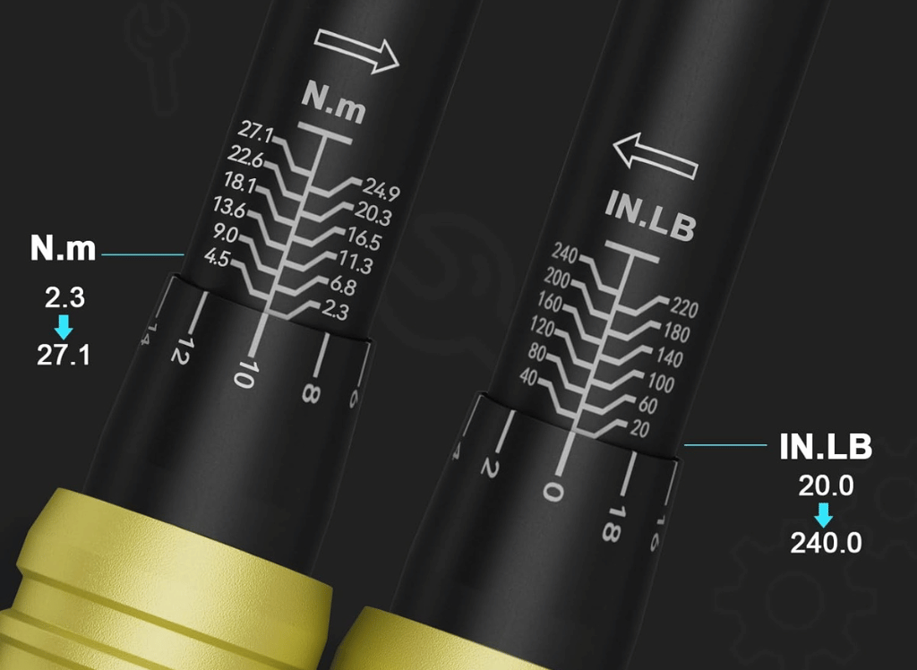Equipped with a non-slip knurled handle made of high-grade aerospace aluminum, this torque wrench also features a patented slide-to-lock mechanism for setting your desired torque. The highlighted yellow print on the dual-range scale allows easy reading in low-light conditions. With an easy-to-rotate handle, this wrench reduces effort and prevents hand fatigue by up to 62%, setting it apart from other bike torque wrenches on the market.