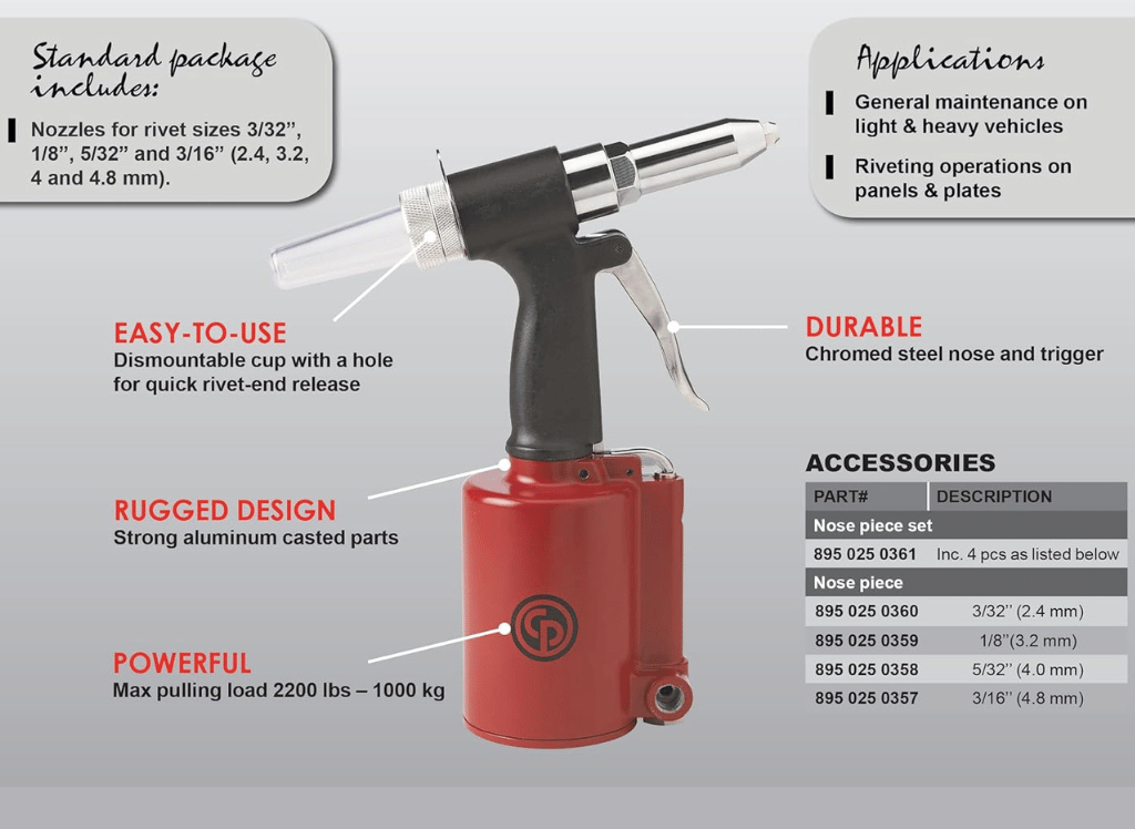 The Chicago Pneumatic CP9882 Air Riveter is a robust and reliable tool that offers exceptional performance for all riveting tasks. With a powerful setting force of 9.8kN, it can easily process blind rivets up to 3/16 inches in materials such as copper and aluminum. This makes it ideal for various industries such as body shops, MROs, special machinery, light assembly markets, etc.