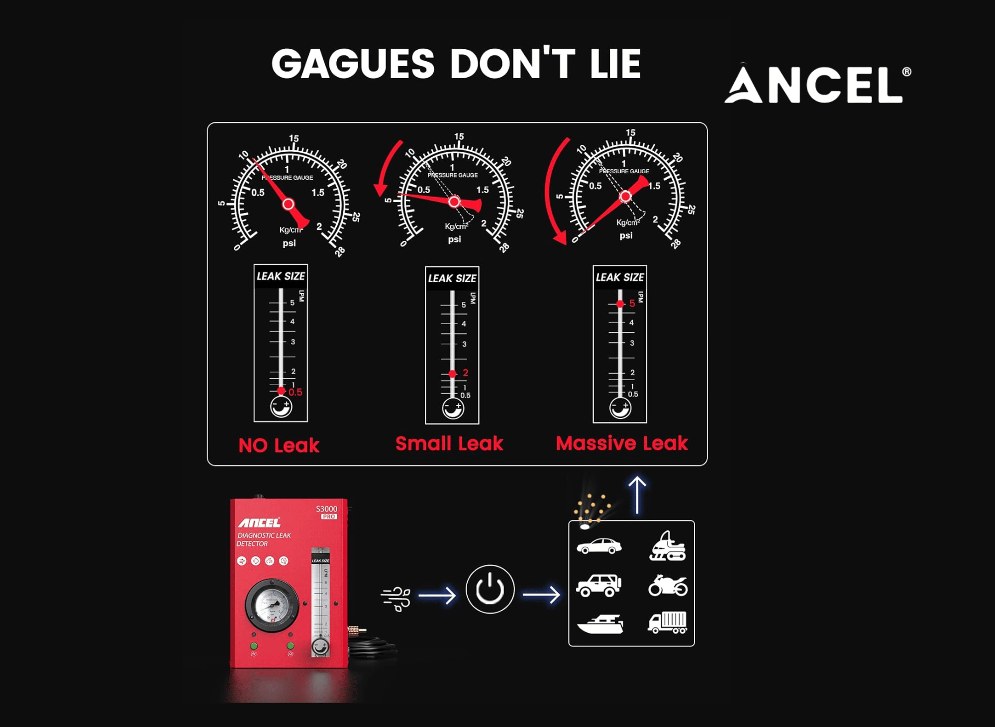 A standout feature of the ANCEL S3000 is its trio of leak status indicator lights: No Leak, Small Leak, and Massive Leak. These clear, visual prompts instantly inform you of the leak status within your vehicle’s system, eliminating the guesswork from diagnostics.