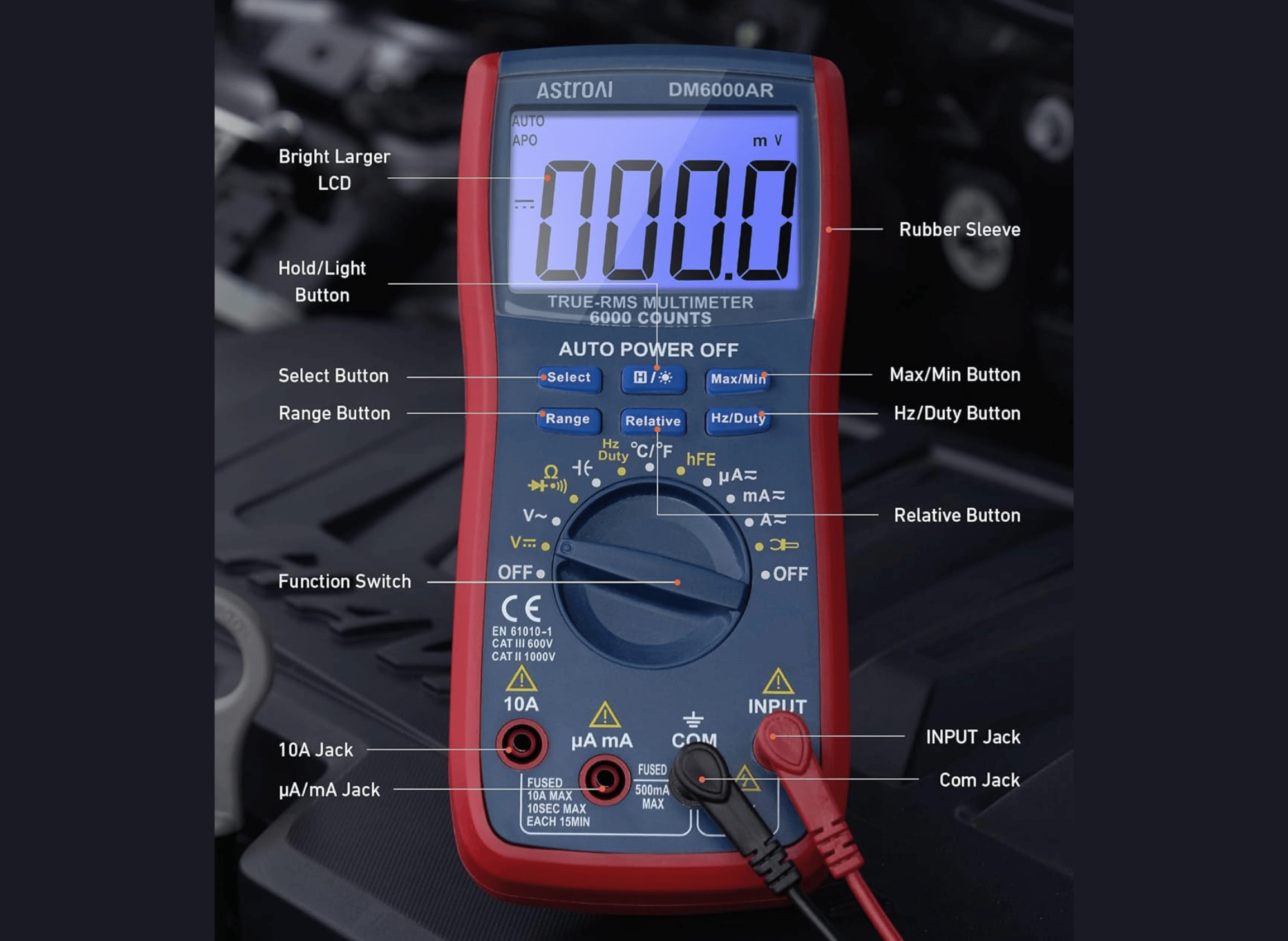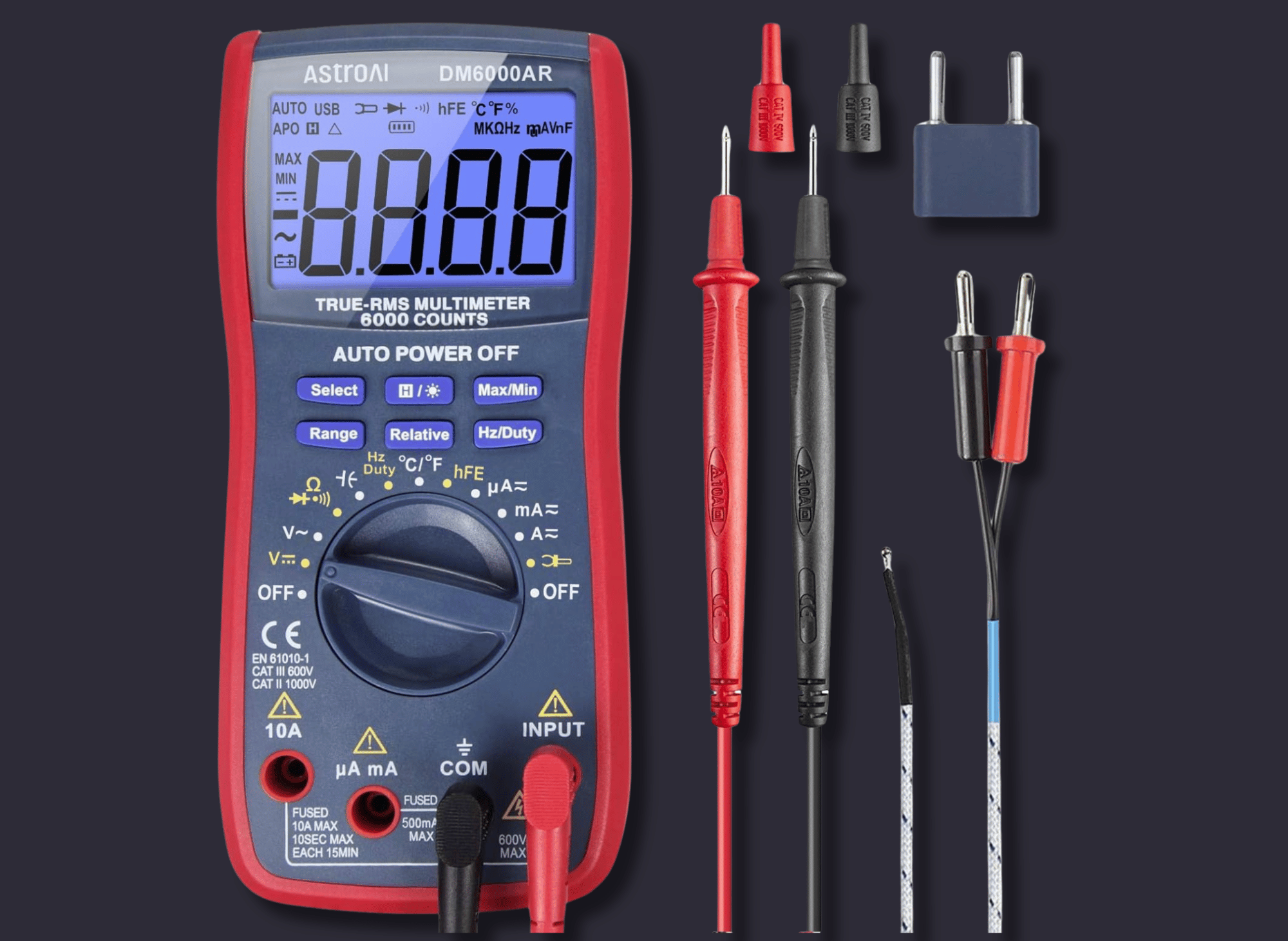 Safety is also a top priority with the AstroAI Multimeter as it is certified with CE and RoHS and strictly adheres to IEC61010-1 CAT.III 1000V, CAT.IV 600V overvoltage safety standards and pollution level 2. The dual ceramic fuses provide anti-burn and overload protection, while the silicone cover ensures durability and protection against electric shock.