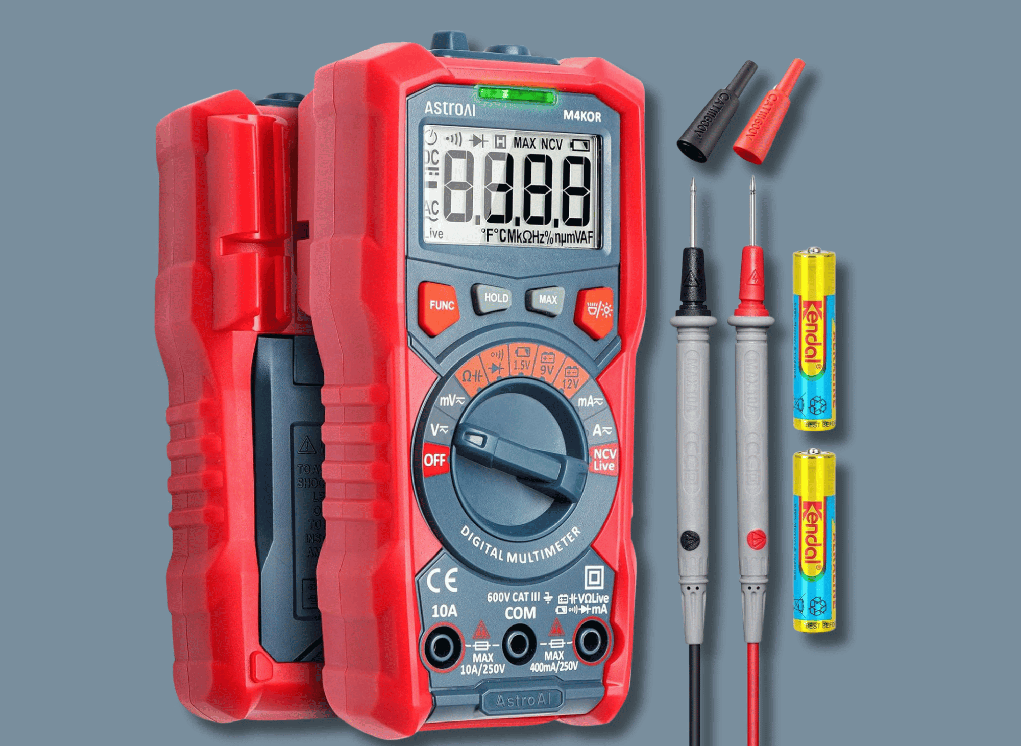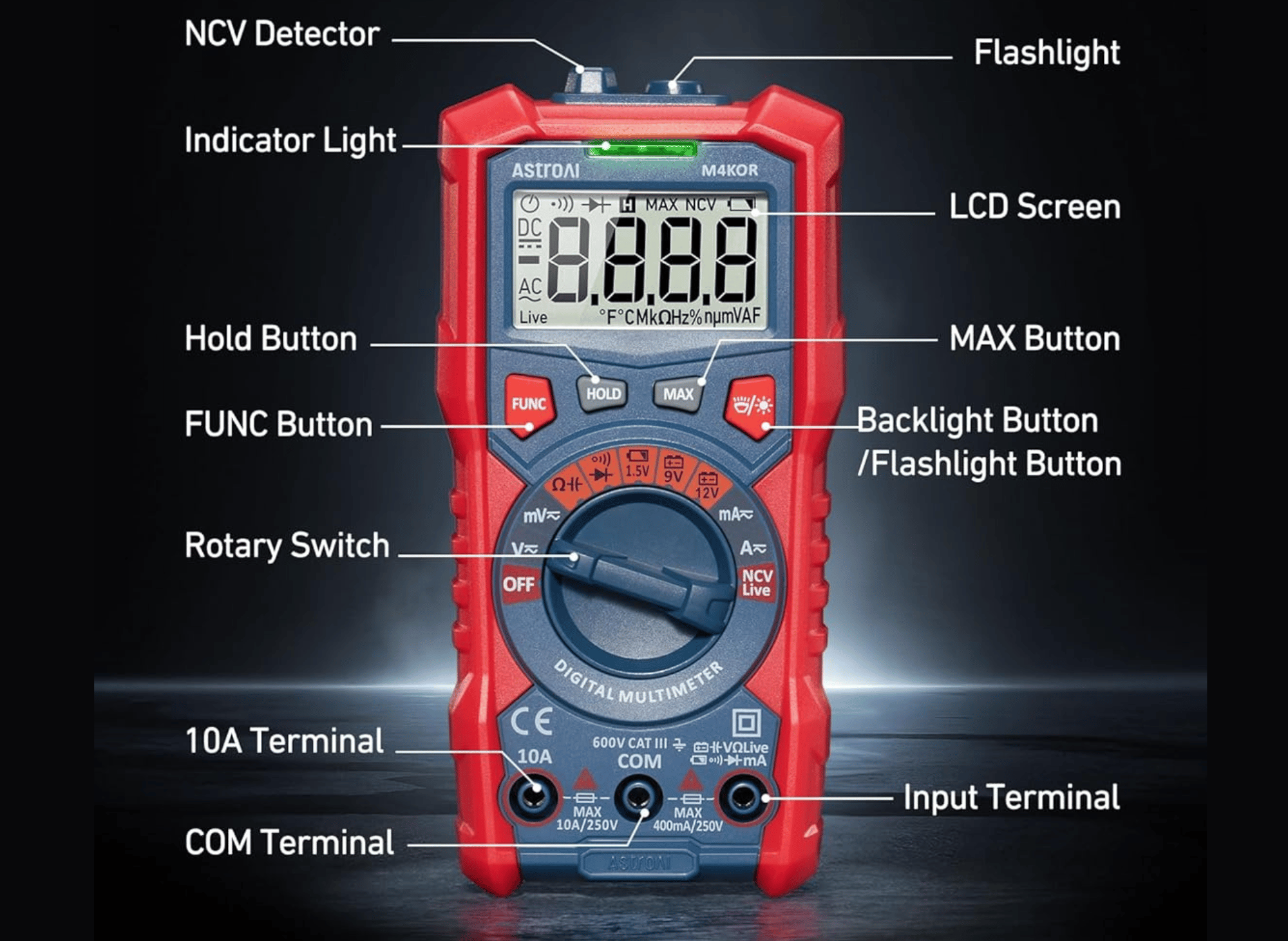 Designed for convenience and ease of use, the AstroAI Multimeter boasts features such as Data Hold, Max, Auto Shut-off, low battery indicator, and a backlit LCD screen. The included flashlight makes it perfect for use in dimly lit environments. Plus, the red durable silicone cover not only protects the multimeter from damage but also provides insulation against electric shocks.