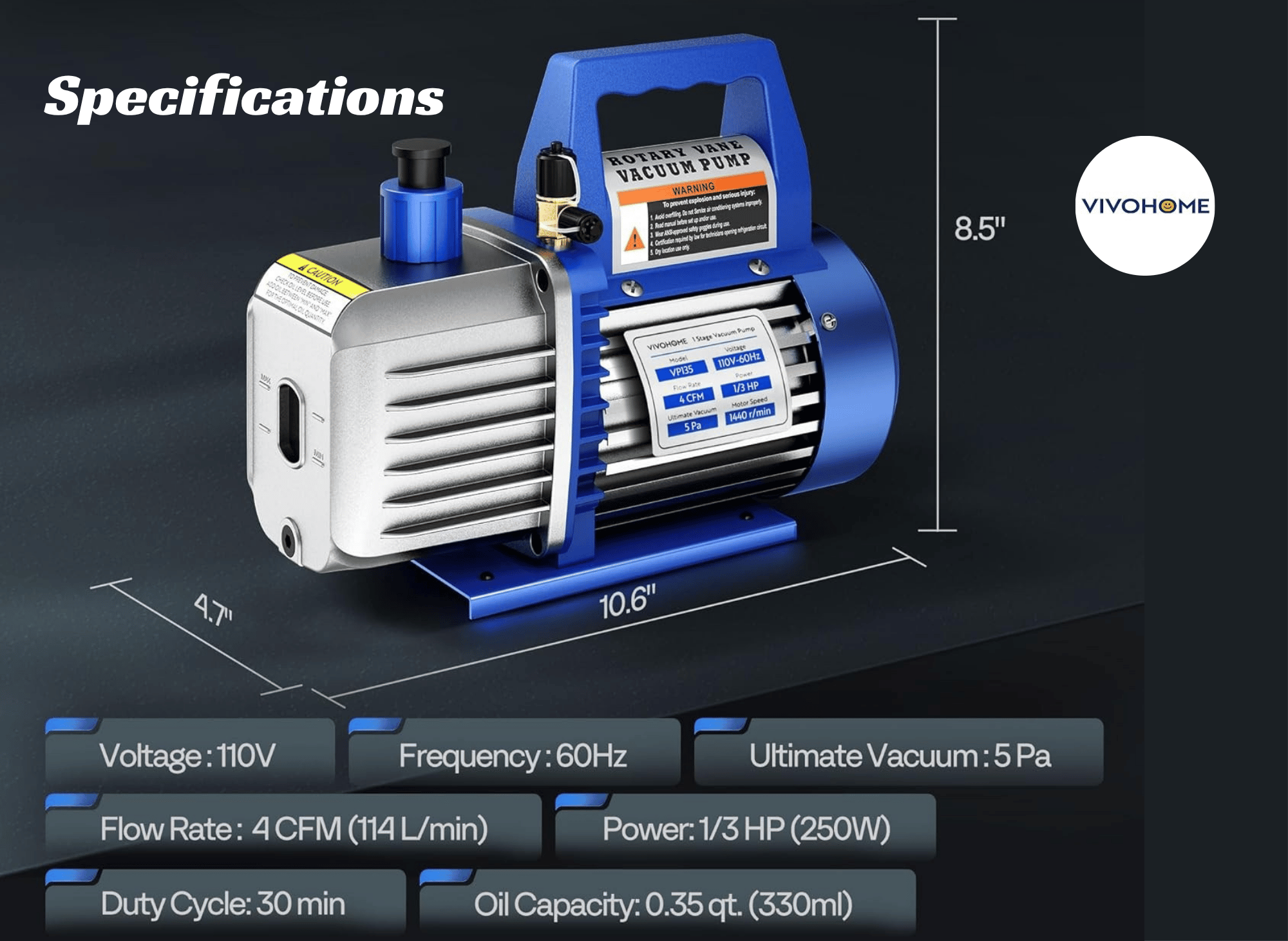 Maintaining your home’s air conditioning system or working on automotive AC repairs requires the right tools for the job. The VIVOHOME 110V 1/3 HP 4CFM Single Stage Rotary Vane Air Vacuum Pump and R134a AC Manifold Gauge Set Kit promises to deliver professional-grade performance at an affordable price point and is specifically designed for vehicle air conditioning systems. Therefore, it's essential to verify its effectiveness.