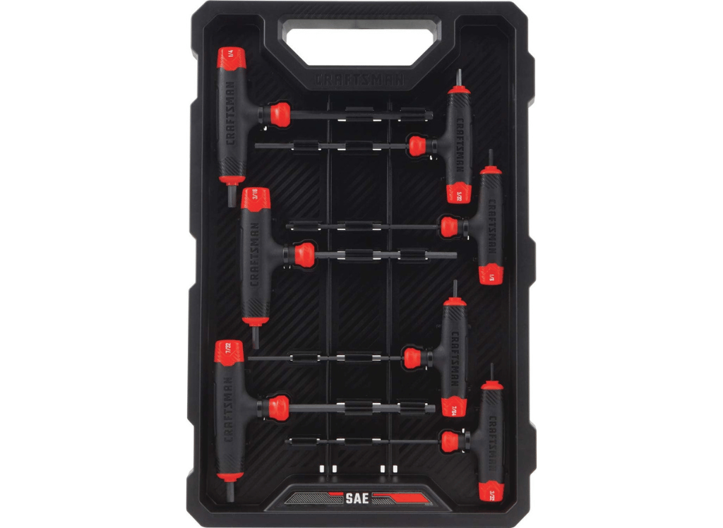 The CRAFTSMAN Hex Key Set is an excellent option for anyone needing a high-quality hex key set. These Allen wrenches are solid steel and feature a black oxide coating. The T-handle design allows for greater leverage, increasing torque strength with continual safety.