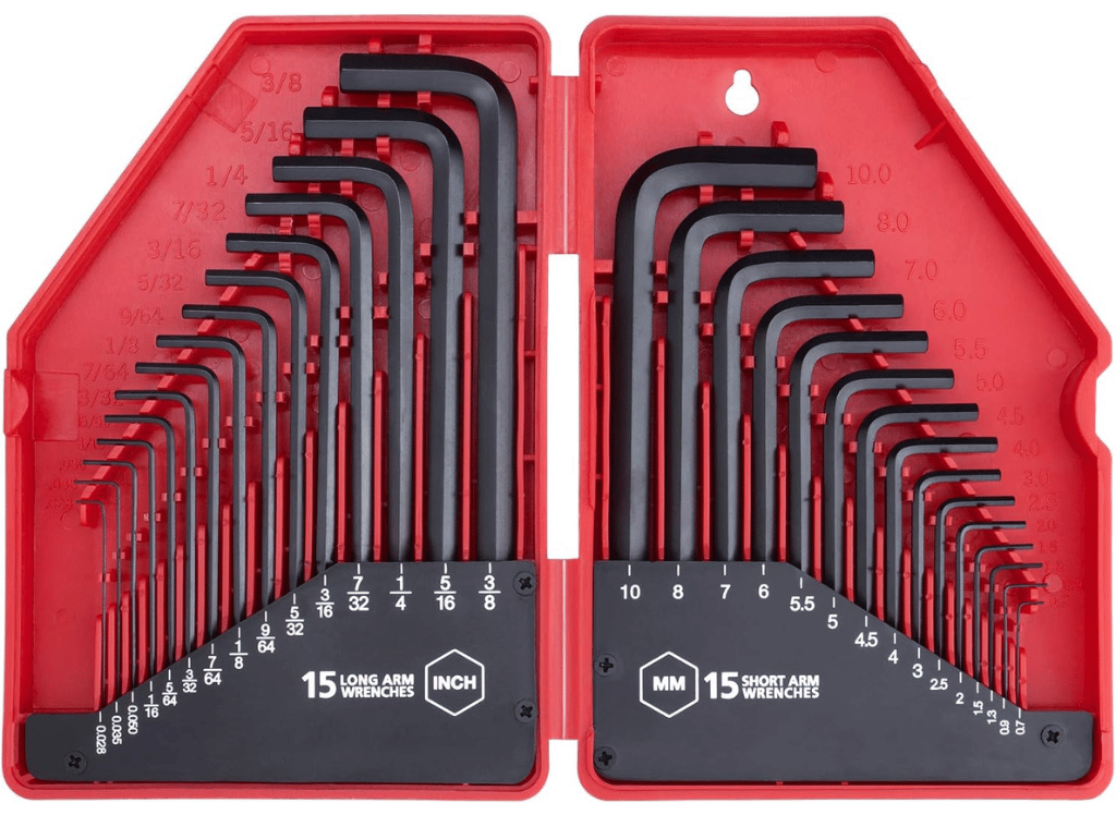 This Premium Hex Key Allen Wrench Set includes sizes from large to small and even mini: (15) Standard SAE 0.028, 0.035, 0.05, 1/16, 5/64, 3/32, 7/64, 1/8, 9/64, 5/32, 3/16, 7/32, 1/4, 5/16, 3/8” and (15) Metric 0.7, 0.9, 1.3, 1.5, 2, 2.5, 3 ,4 ,4.5 ,5 ,5.5 ,6 ,7, 8 and 10mm sizes in one convenient set!