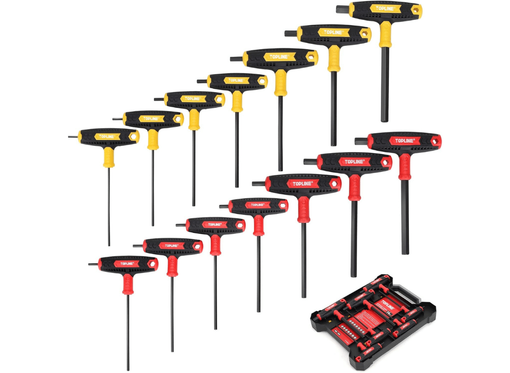 If you're looking for an Allen wrench set that can handle just about any job, the TOPLINE 14-Piece Metric&SAE T-Handle Allen Wrench Set is a great choice. Made of heat-treated chrome vanadium steel with a black oxide finish, the blades are built to last.