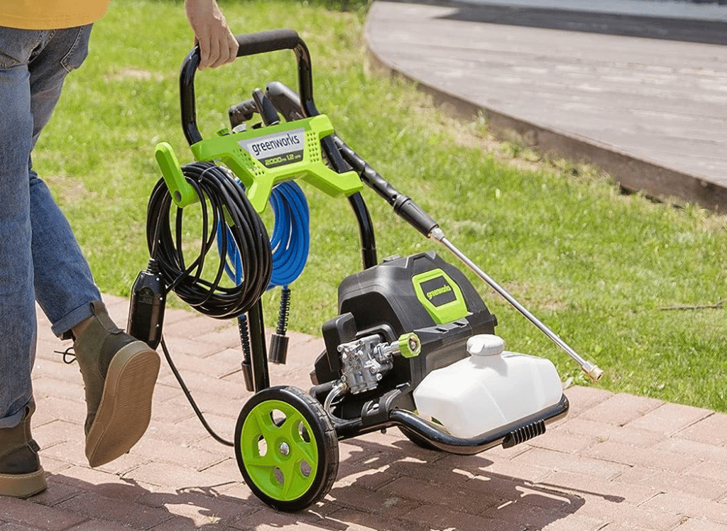 The Greenworks Pressure Washer is a powerful and efficient machine that is perfect for cleaning medium-duty projects around the home. It features a 14 amp motor that is capable of delivering 2000 PSI of pressure at 1.2 GPM, making it ideal for cleaning patios, grills, walkways, and vehicles.
