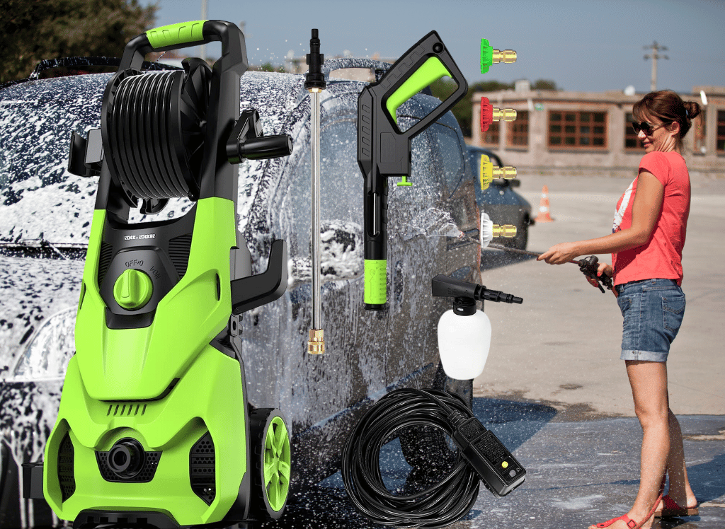 This heavy-duty machine can generate up to 1800 watts of power, giving you the max cleaning power of 3500 PSI and 2.6GPM. Tar, grease, oil stains, rust, and other stubborn gunk and grime are easily cleaned thanks to the Rock and Rocker high-pressure washer. This truly is a nice machine for car washing purposes.