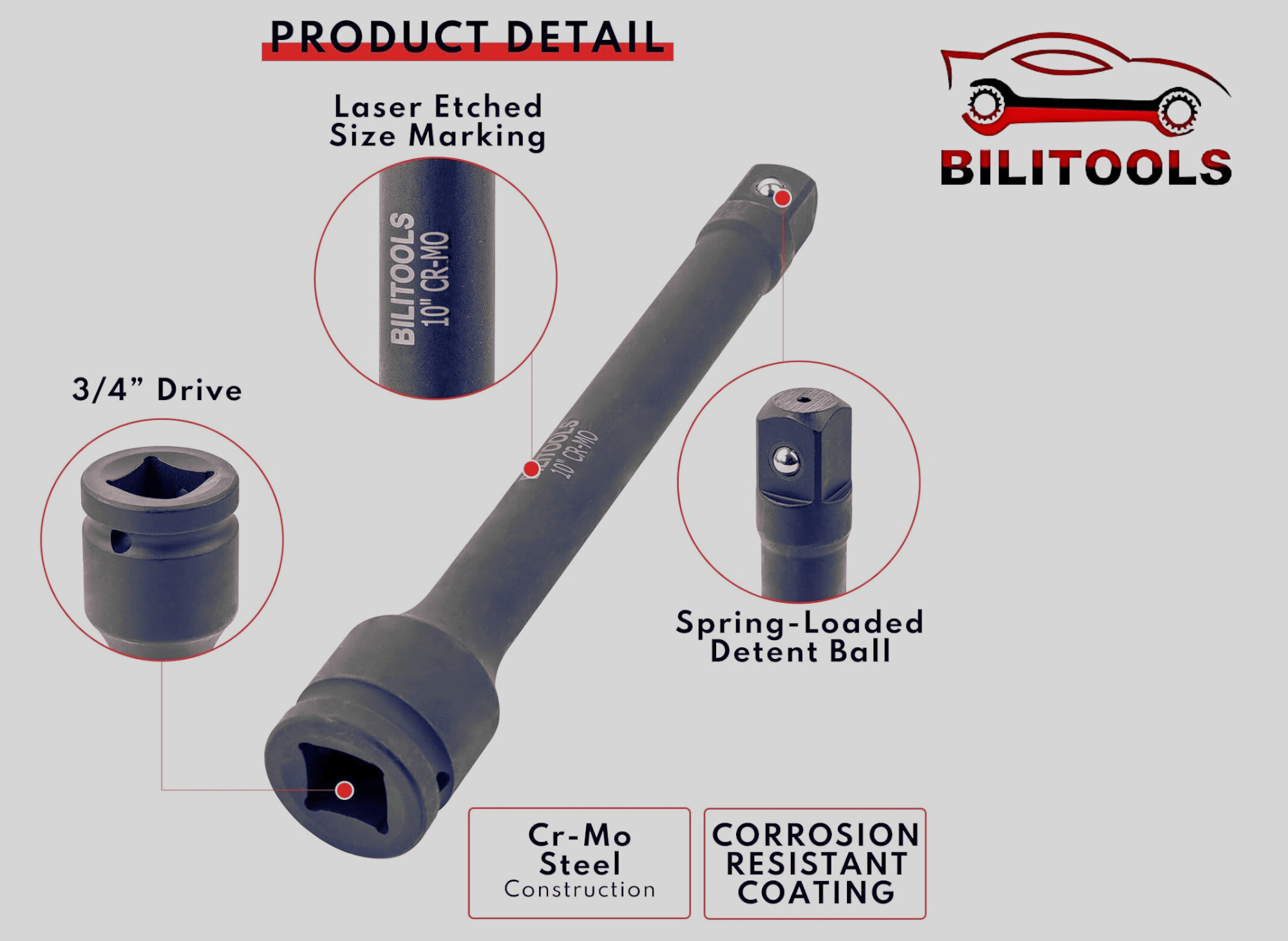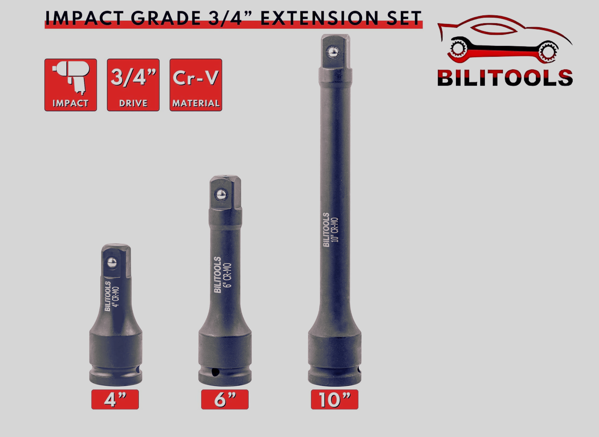 The BILITOOLS 3/4” Drive Impact Extension Set, a BILITOOLS 3/4 drive product, is engineered for those who demand reliability and performance from their tools, especially when working in hard-to-reach areas. This extension set is constructed from premium 10 CR-MO steel—also known as chrome-molybdenum steel—ensuring each drive impact extension bar delivers exceptional strength, durability, and a long service life, even under the most challenging conditions.