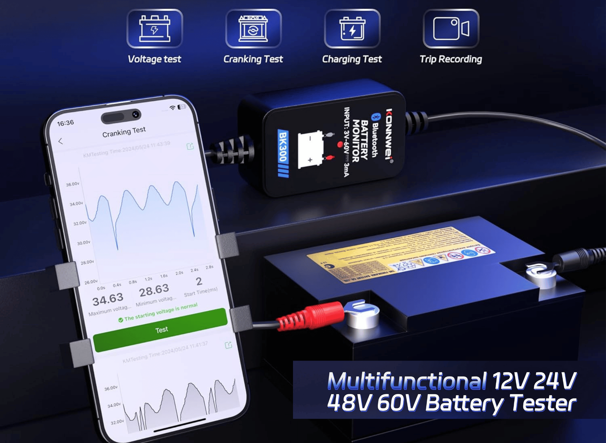 12V 24V 48V 60V Car Battery Tester, Free APP, Bluetooth 5.2 chip, Support Voltage/Starting/Charging Test Function. Suitable for Car/RV/Motorcycle/Truck/Boat