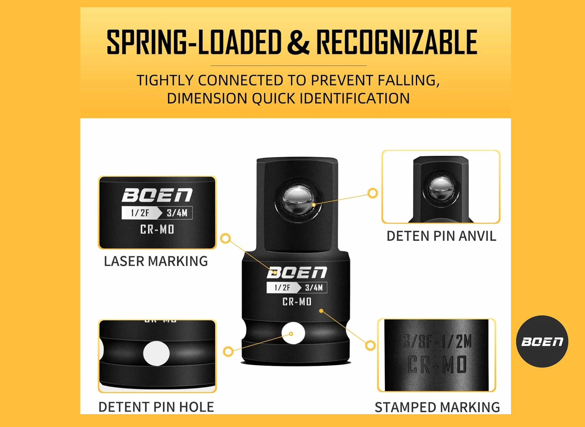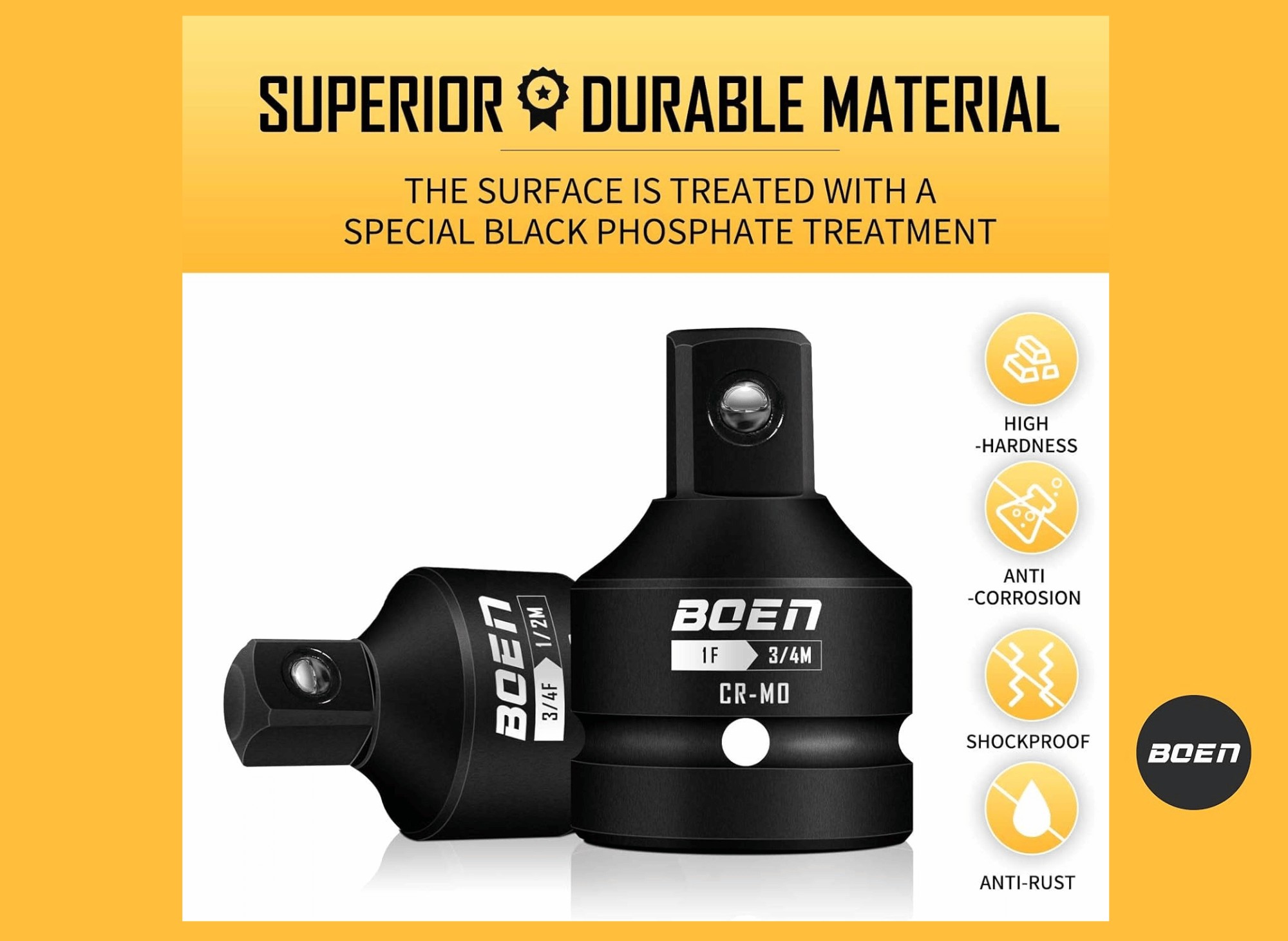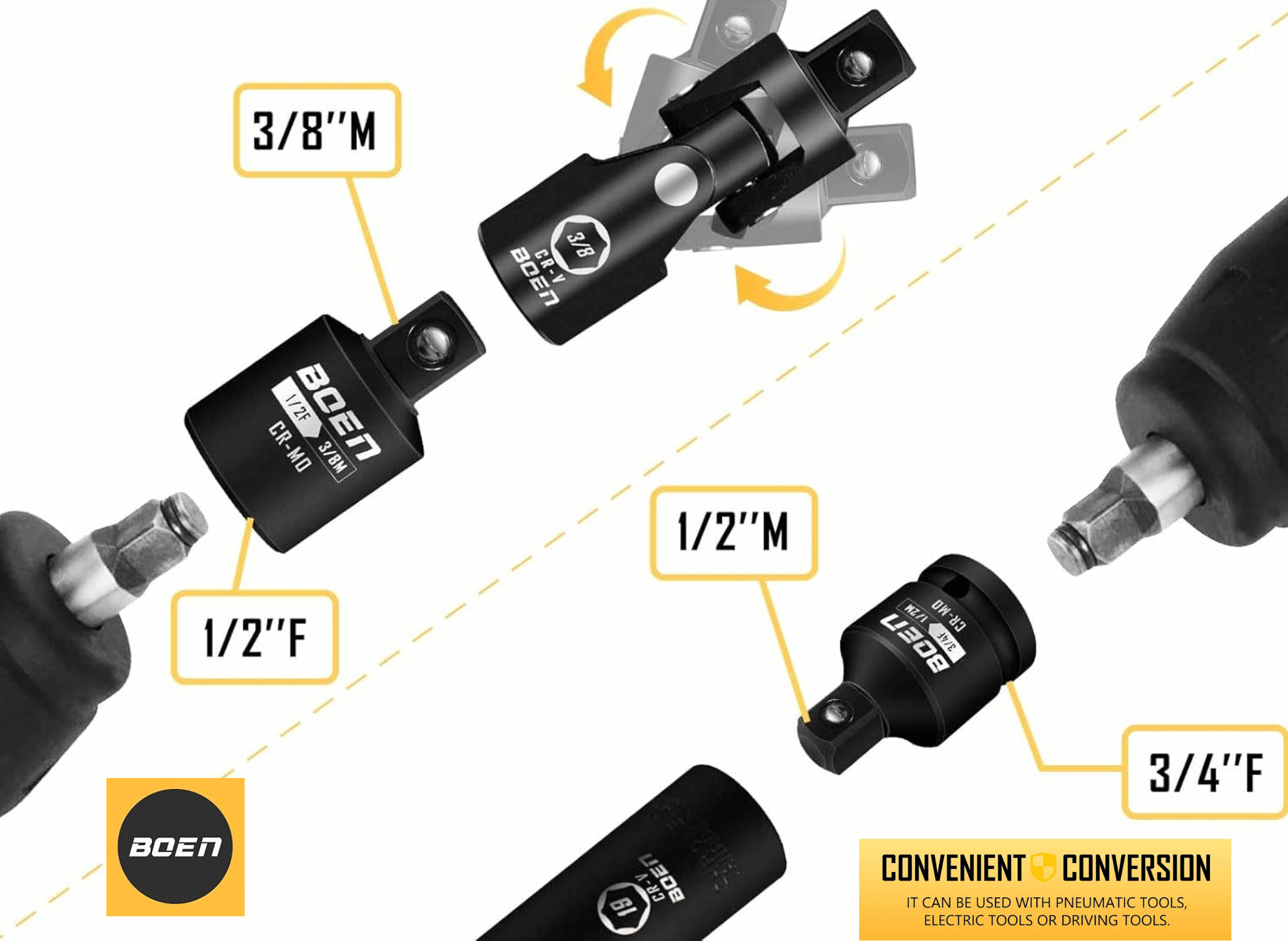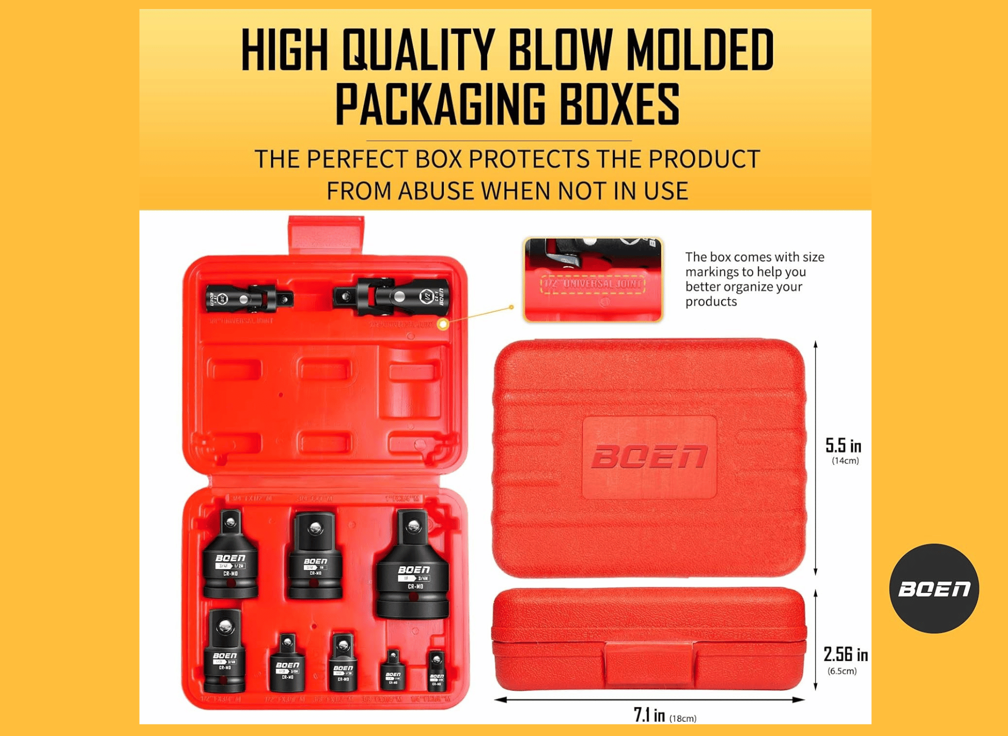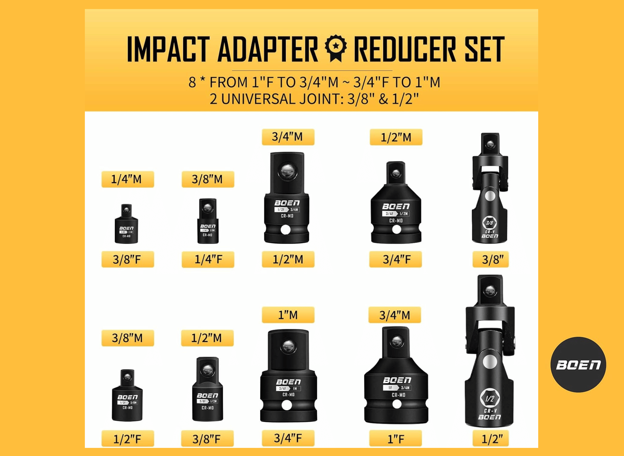 The BOEN 10-Piece Impact Socket Adapter and Reducer Set is a wise investment for anyone who frequently uses impact tools. Designed with professional-grade materials, this set offers a level of durability and versatility that is hard to beat at its price point.
