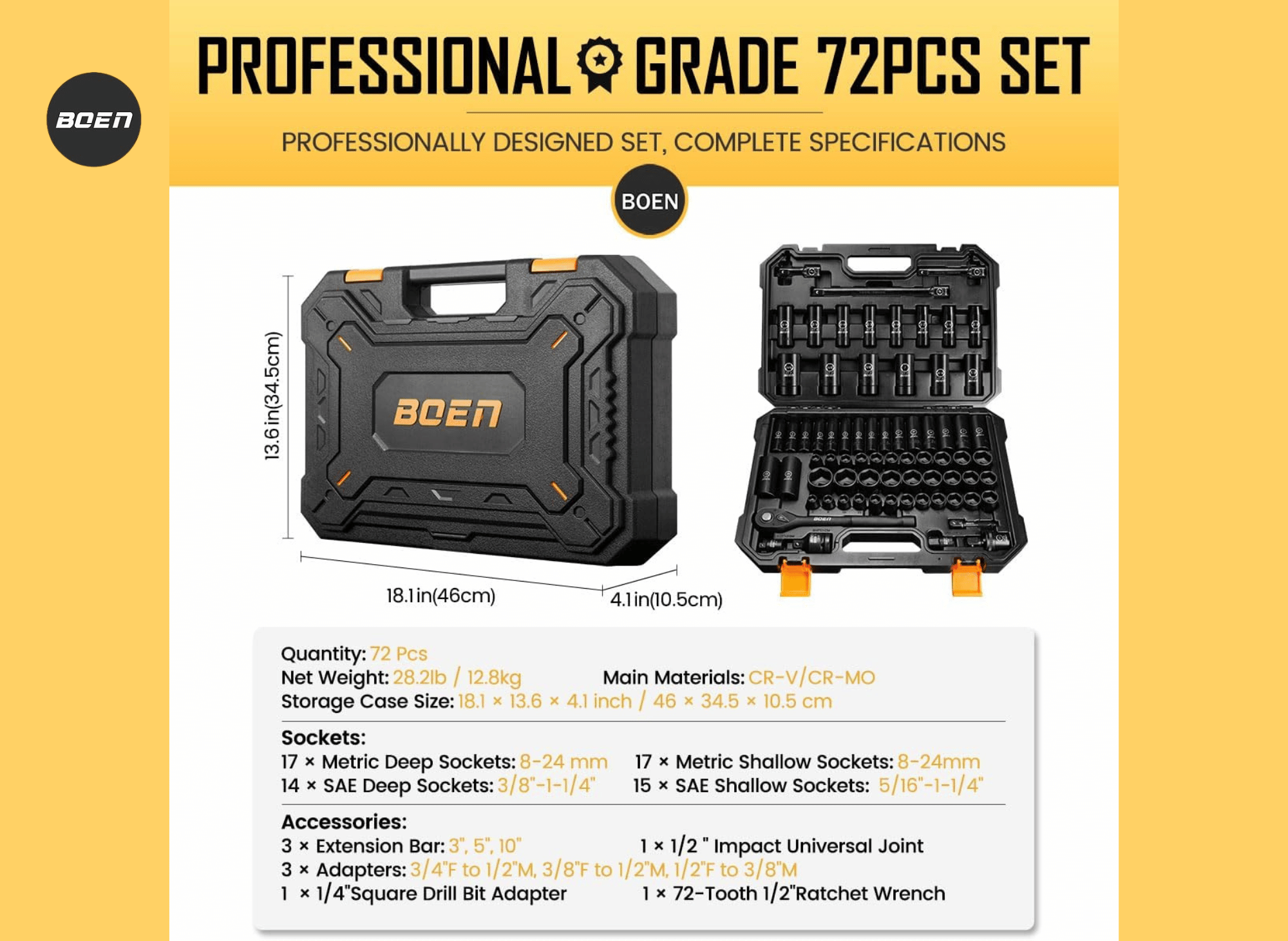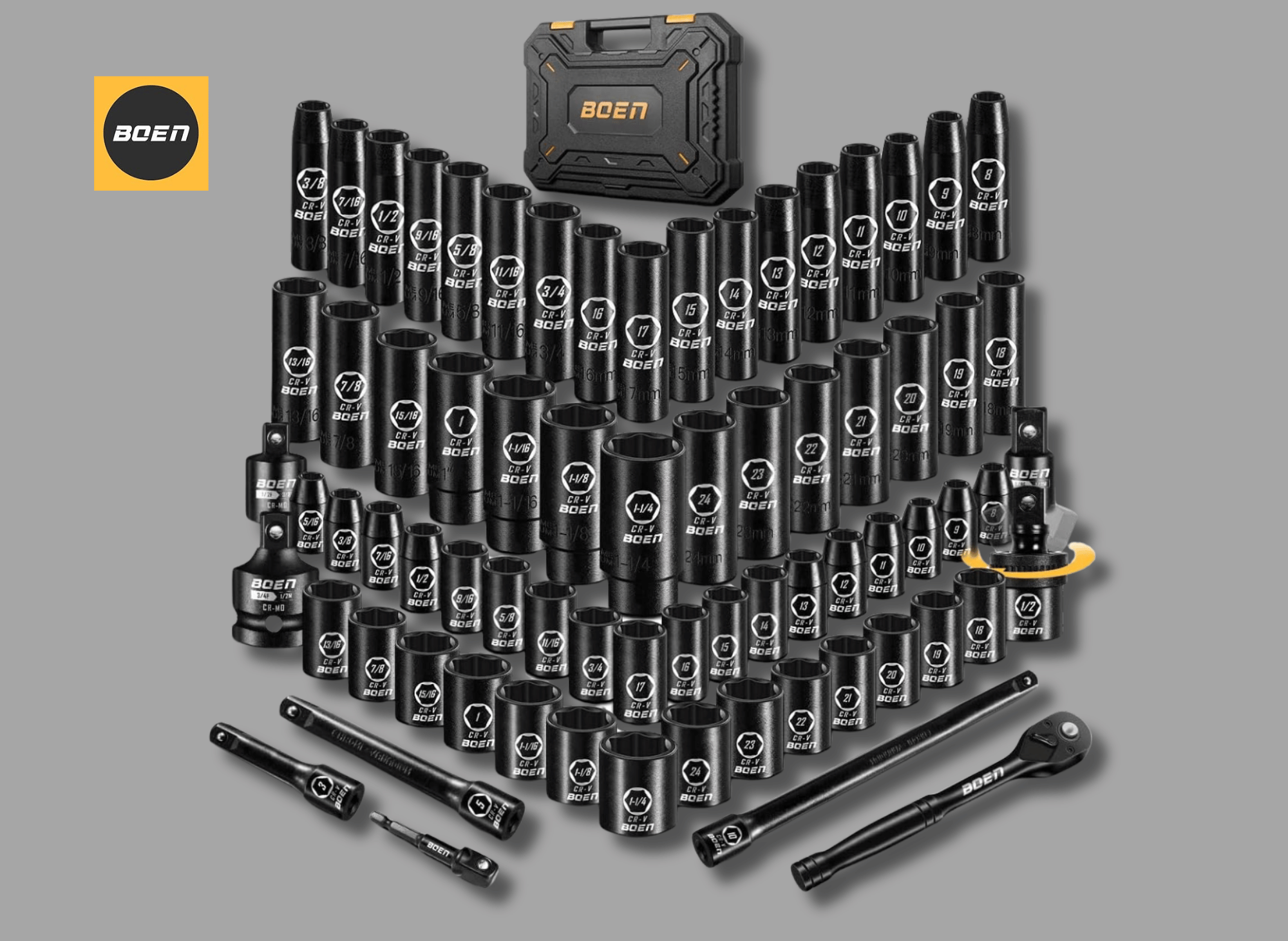 We review the BOEN 72-piece 1/2" Drive Impact Socket Set. Features heavy-duty Cr-V steel, SAE & Metric sizes, and a lifetime guarantee.