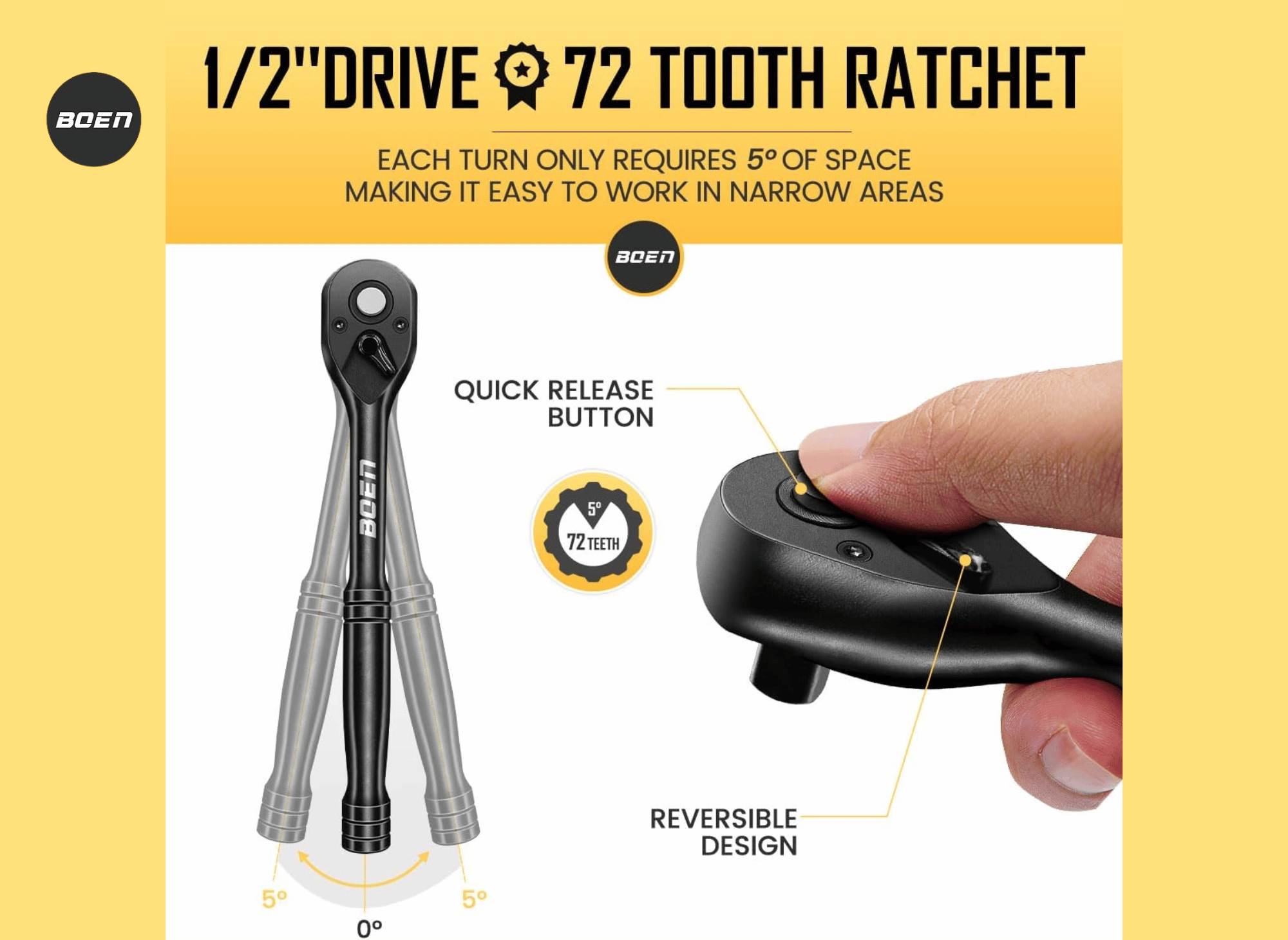 72-Tooth Ratchet Wrench: While this is an impact set, BOEN includes a high-quality 72-tooth 1/2" hand ratchet. The high tooth count means you only need a 5-degree swing arc to turn a fastener, making it indispensable for tight spots where an impact gun simply won't fit.