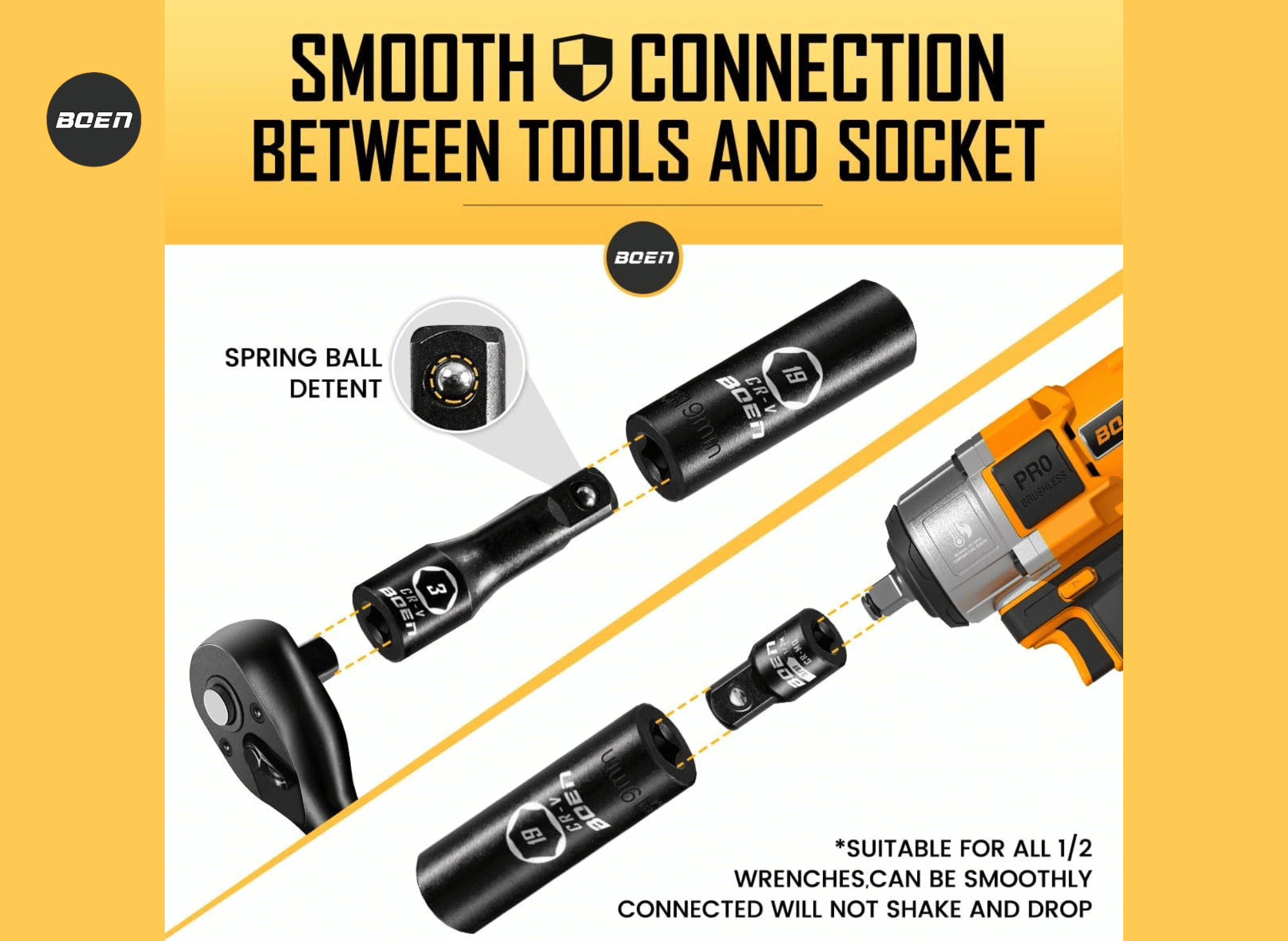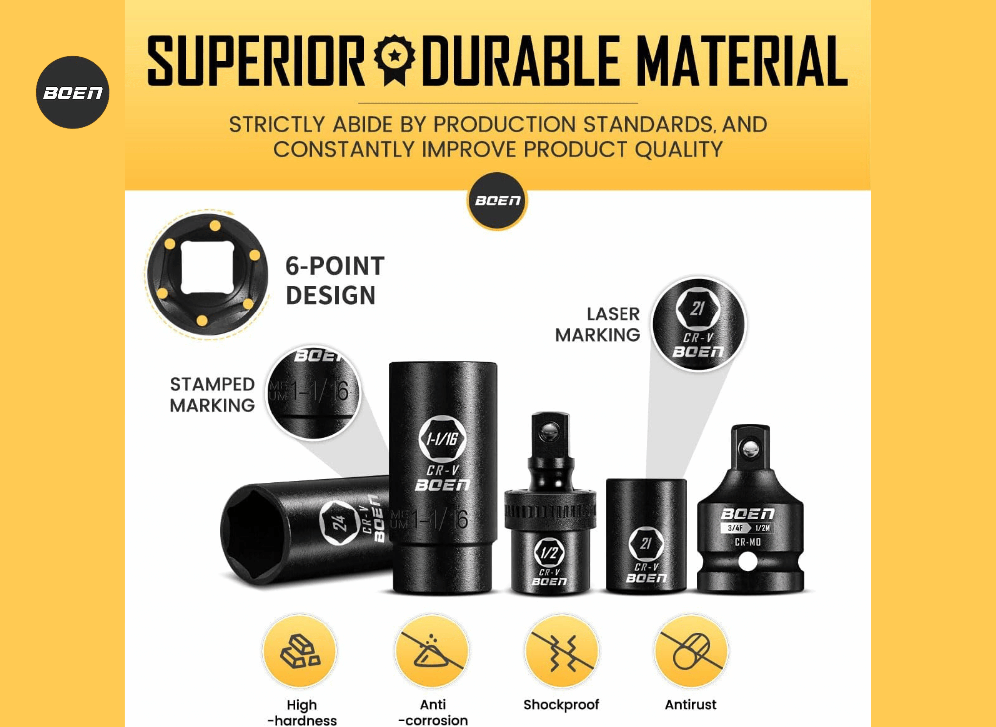 The BOEN set is engineered specifically for impact use. The sockets are forged from high-quality Chromium Vanadium Steel (Cr-V). This alloy provides the perfect balance of hardness and tensile strength, allowing the sockets to absorb the sudden shock of an impact wrench without cracking.