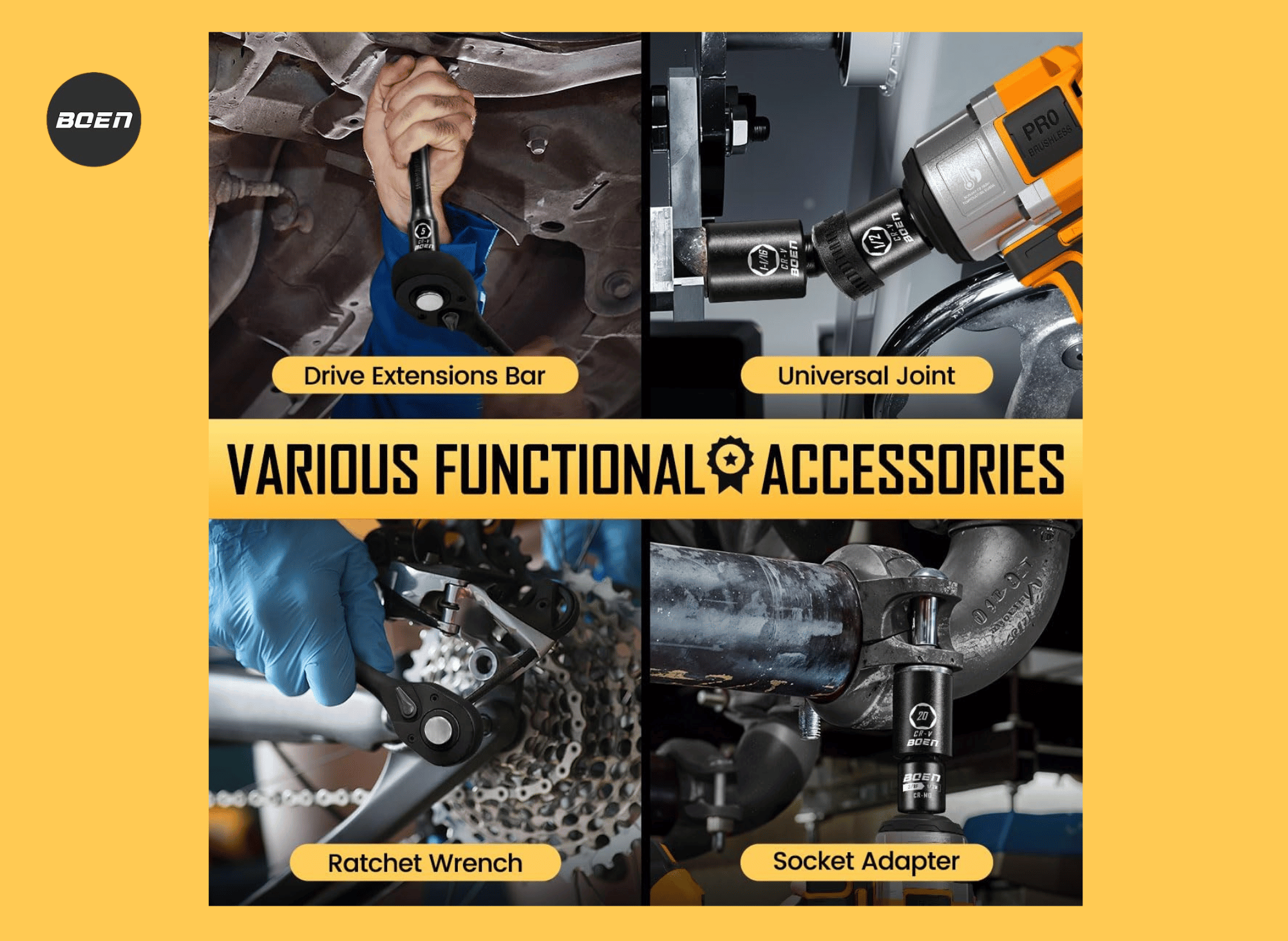 A socket is only as good as its ability to reach the fastener. The BOEN set includes a suite of accessories designed to get you into tight, awkward spaces.