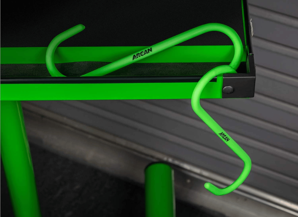 The Arcan 8.5" Coated Steel Brake Caliper Hangers are a highly visible and essential tool for any automotive professional or DIY enthusiast. With their bright green color, these hangers ensure that they are easily identifiable and not left behind on the vehicle after use.