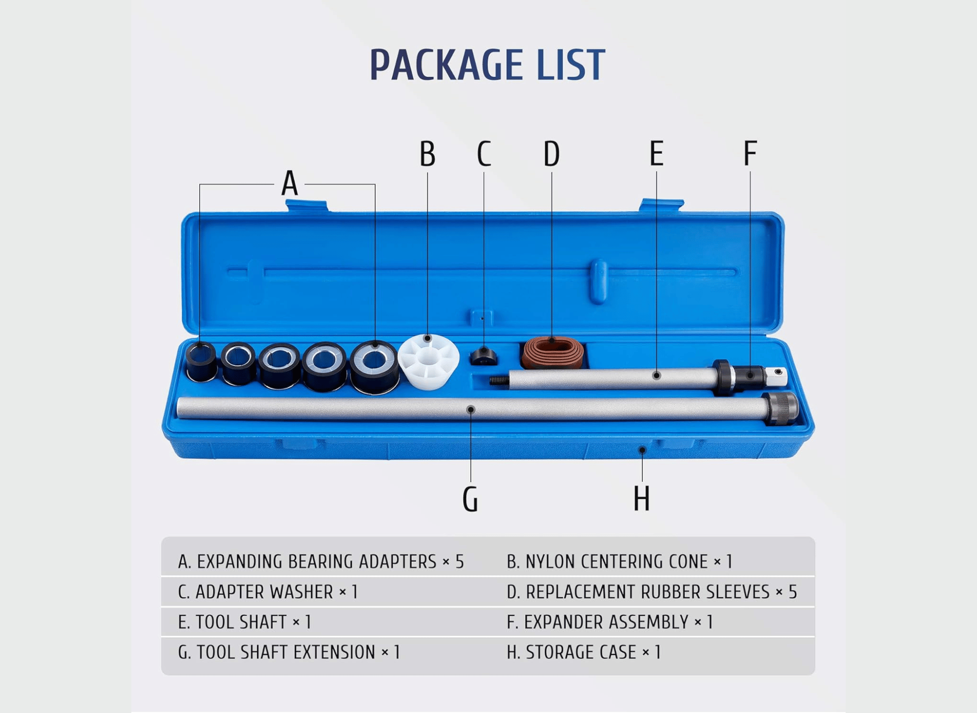 Included in the set are a driving shaft, driving shaft extension, five split driving plugs, two driving collars, centering cone, and a durable blow-molded case for secure storage and transportation. With this tool, you can confidently tackle any camshaft bearing installation or removal task with precision and efficiency.