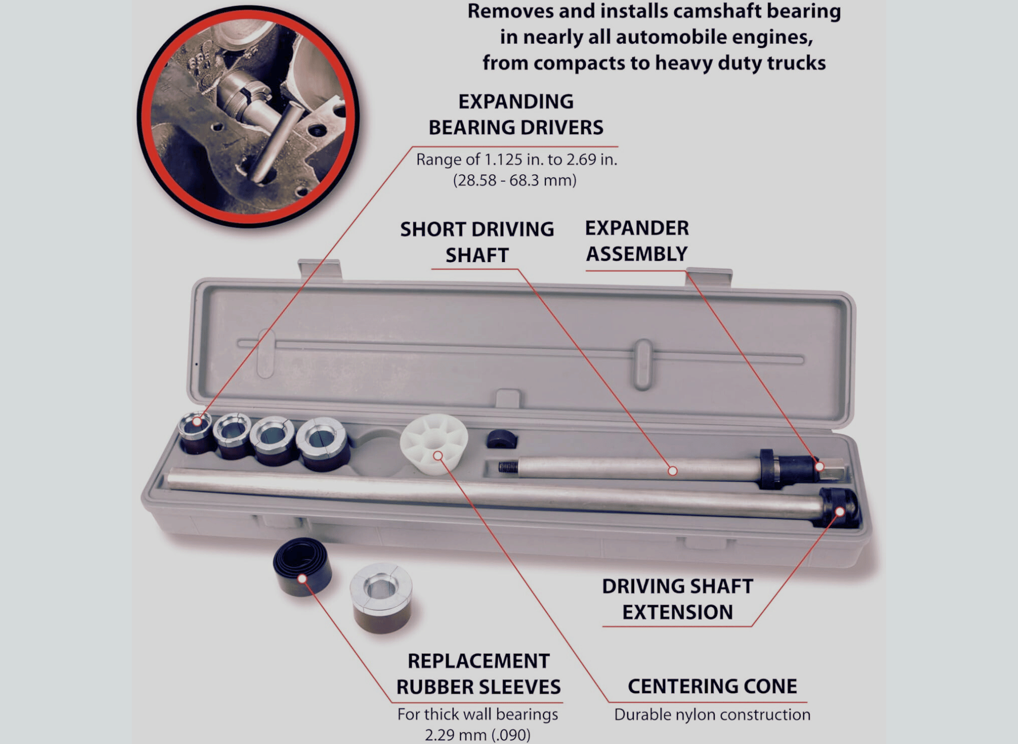 It is capable of driving thick wall bearings efficiently. With a wide application range of 1-1/8 inch to 2-2/3 inches, this tool is compatible with camshaft bearings in various domestic and import vehicles ranging from compact cars to heavy trucks.