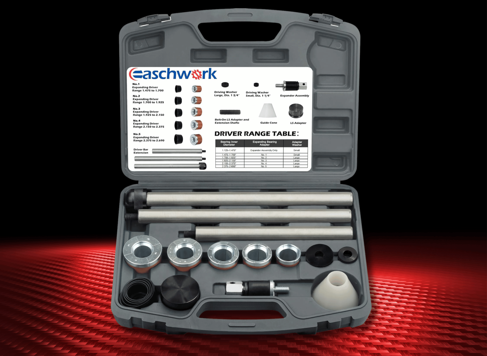 The Easchwork Cam Bearing Install Tool & Engine Cam Bearing Remove Kit. Crafted with precision and perfection in mind, this kit is designed to elevate your performance and redefine versatility. It is also capable of driving thin wall bearings efficiently.