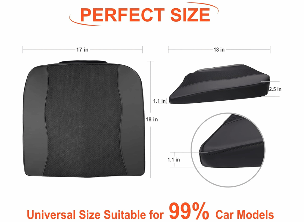 This car seat cushion is 18 inches by 17 inches and 2.5 inches thick, providing ample coverage for maximum comfort. The memory foam fill material adds an extra support layer, promoting proper spinal alignment and posture for a more comfortable driving position.
