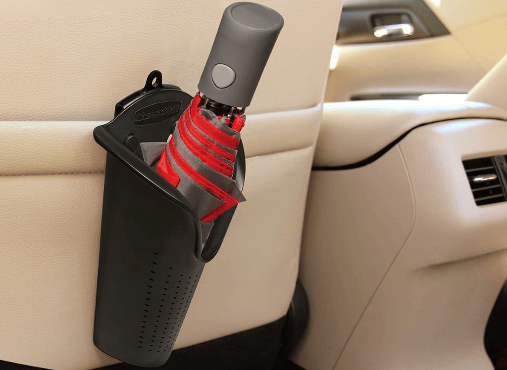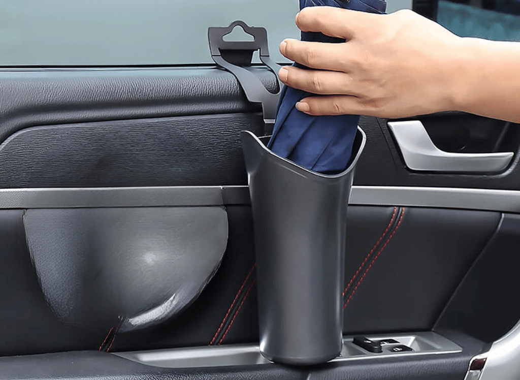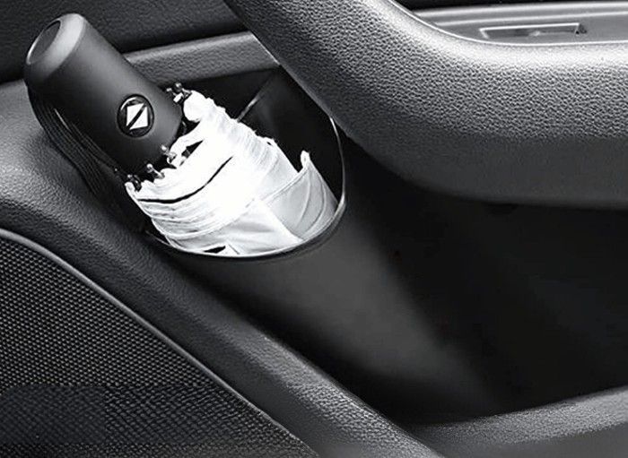 Most car umbrella holders have a universal fit, meaning they can fit most cars. They can be attached to various locations in the car to support the umbrella upright and keep the moisture of your interior. Invest in a car umbrella holder rather than using a small garbage can as a storage tank for your umbrella.