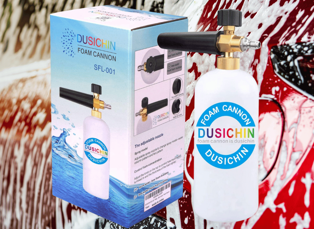 The DUSICHIN Foam Cannon is a powerful adjustable foam lance that performs well with its 1/4" quick disconnection fitting and 33 OZ (1 liter) container bottle. It requires a pressure washer of at least 1000 PSI and 1.2 GPM, making it an ideal choice for heavy-duty cleaning tasks such as removing stubborn dirt from your car or driveway.