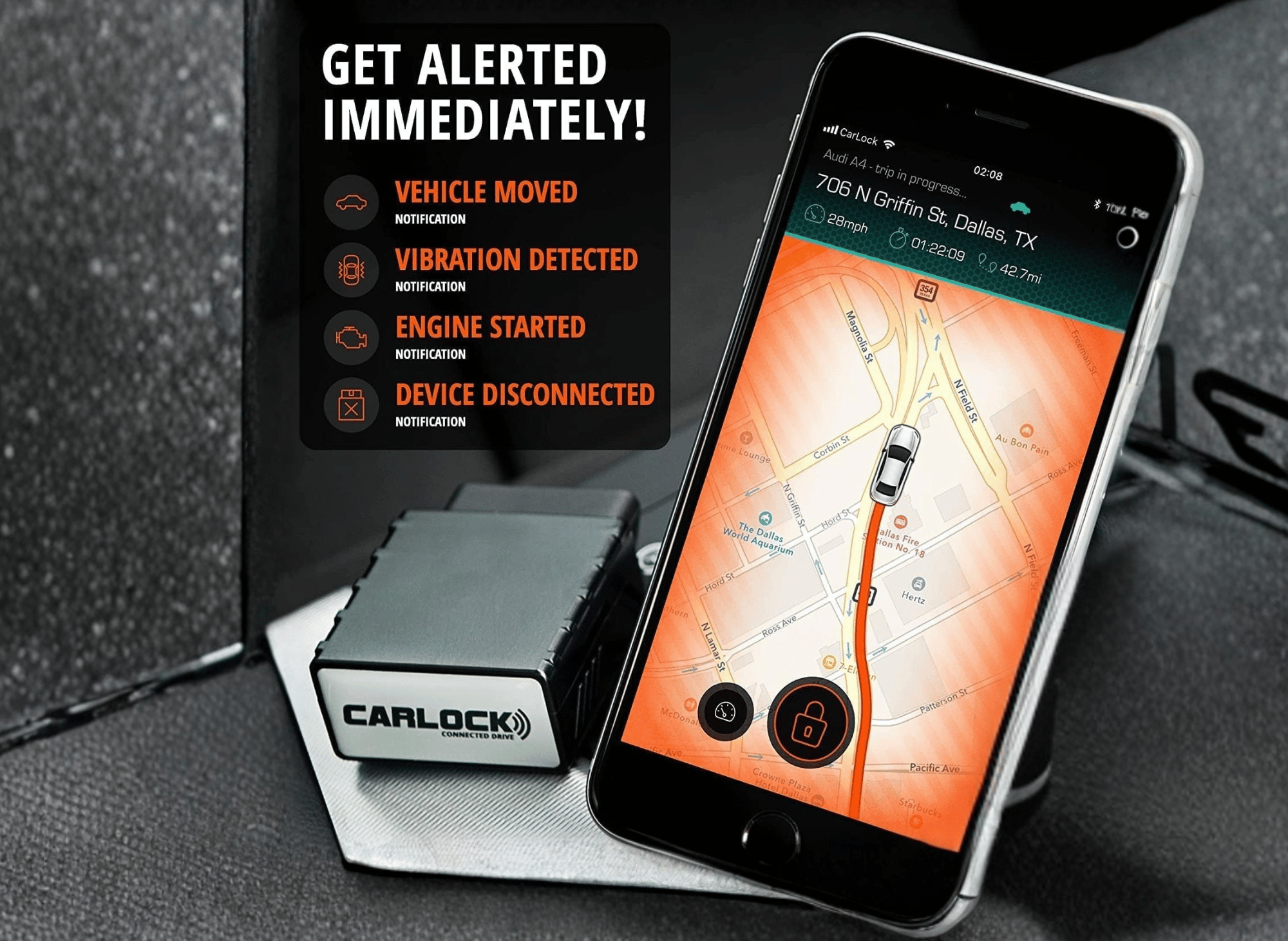 CarLock sends push notifications to your phone the moment it detects specific events. You will receive an alert for: