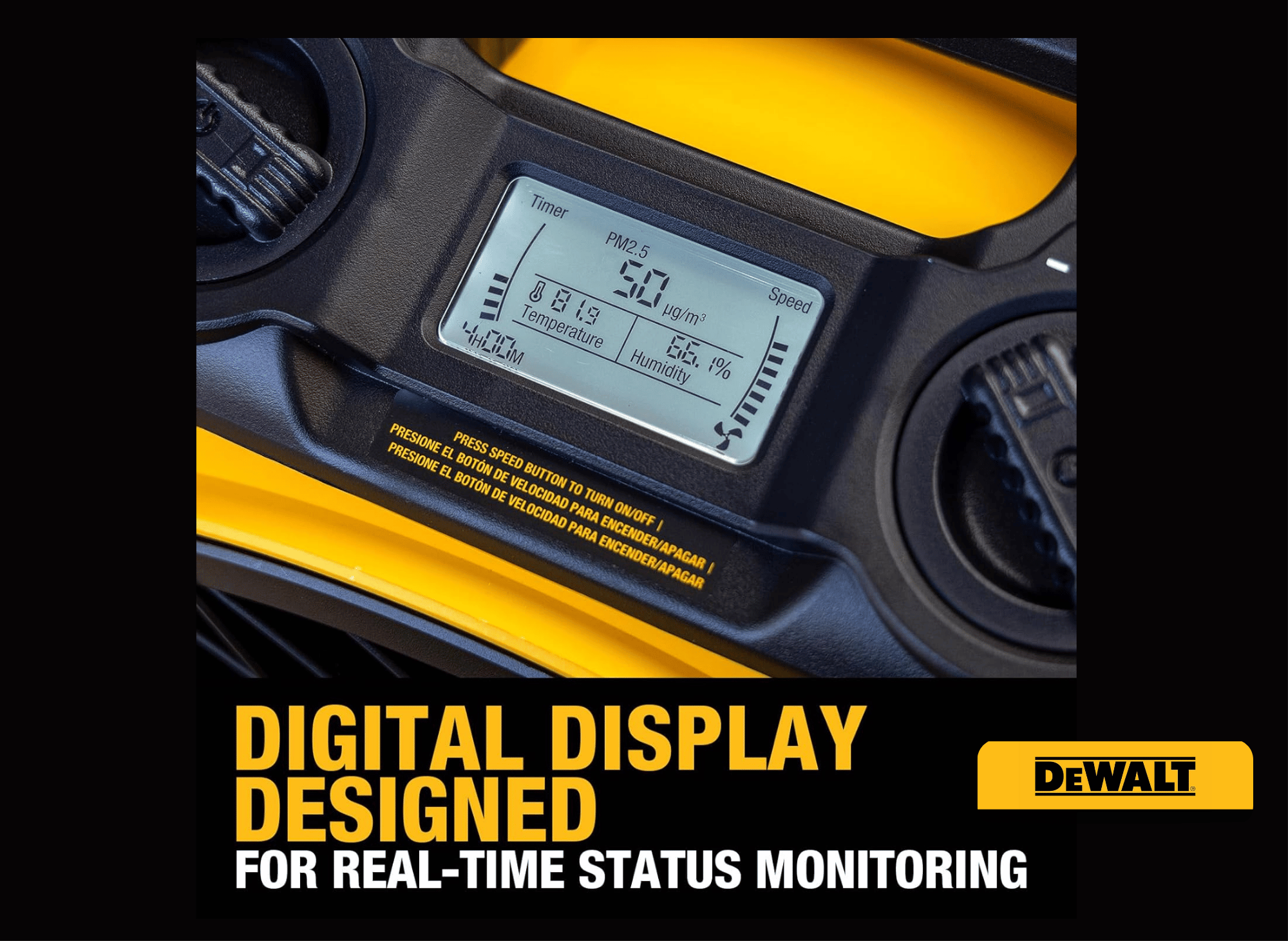 The DEWALT Air Purifier Fan features a sophisticated digital display panel that sets it apart from standard industrial fans. This smart display provides real-time environmental monitoring, showing: