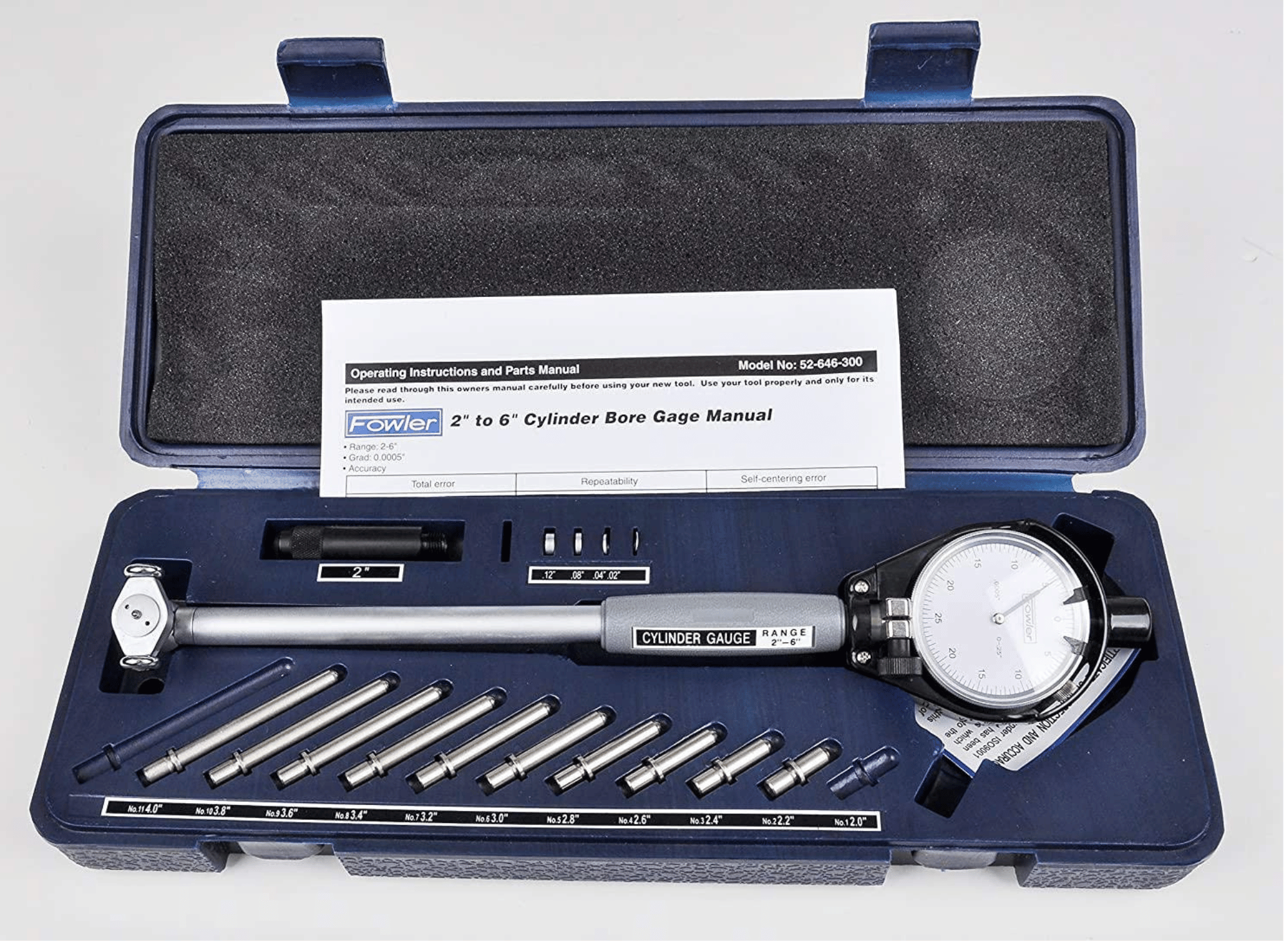 The Fowler 52-646-300-0 Cylinder Dial Bore Gage is designed for accurate and precise measurements. With a dial indicator featuring graduations of 0.0005” and a measuring depth of 9.5”, this bore gauge is perfect for detecting geometry abnormalities and measuring hole diameters in the 2 to 6-inch range.