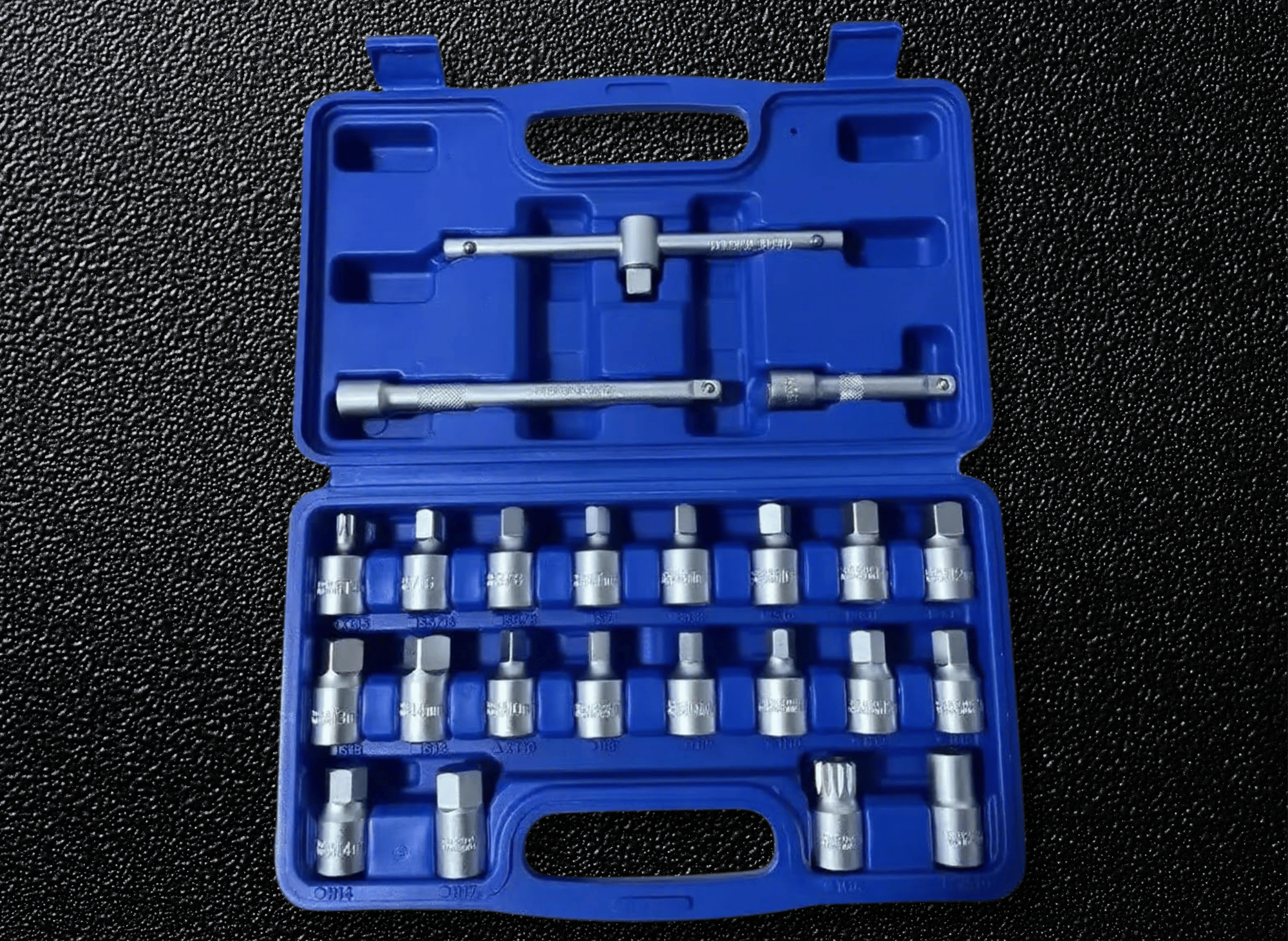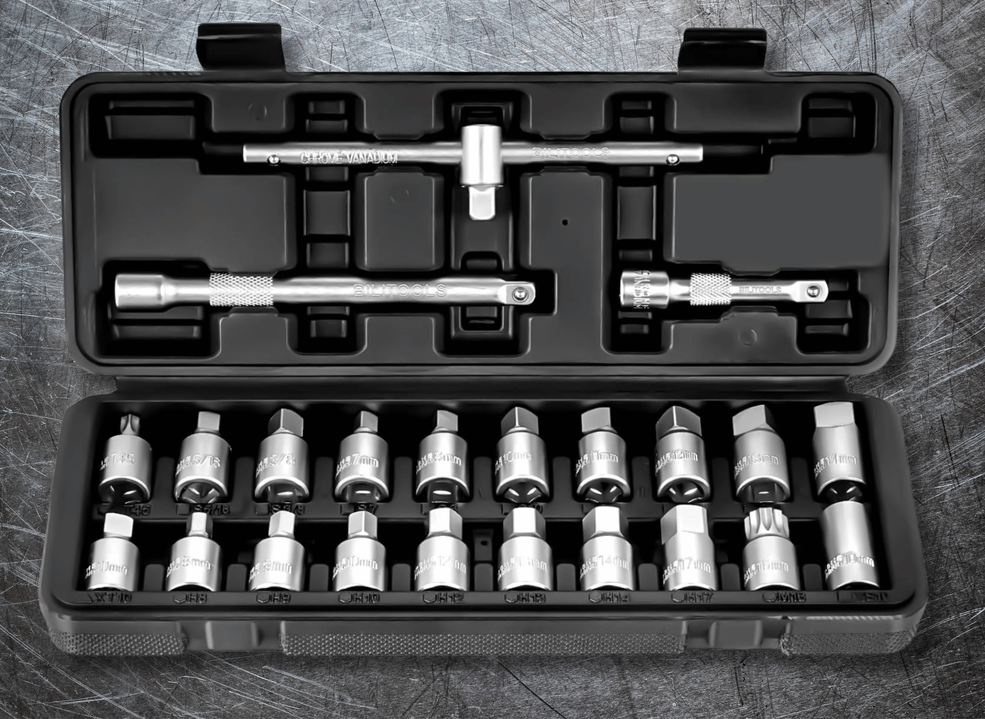 The BILITOOLS set delivers exceptional value with comprehensive coverage across most vehicle types. This 23-piece collection includes seven hex sockets (8-17mm), nine square sockets (5/16" through 14mm), plus specialty options including spline, Torx, and triangle configurations.