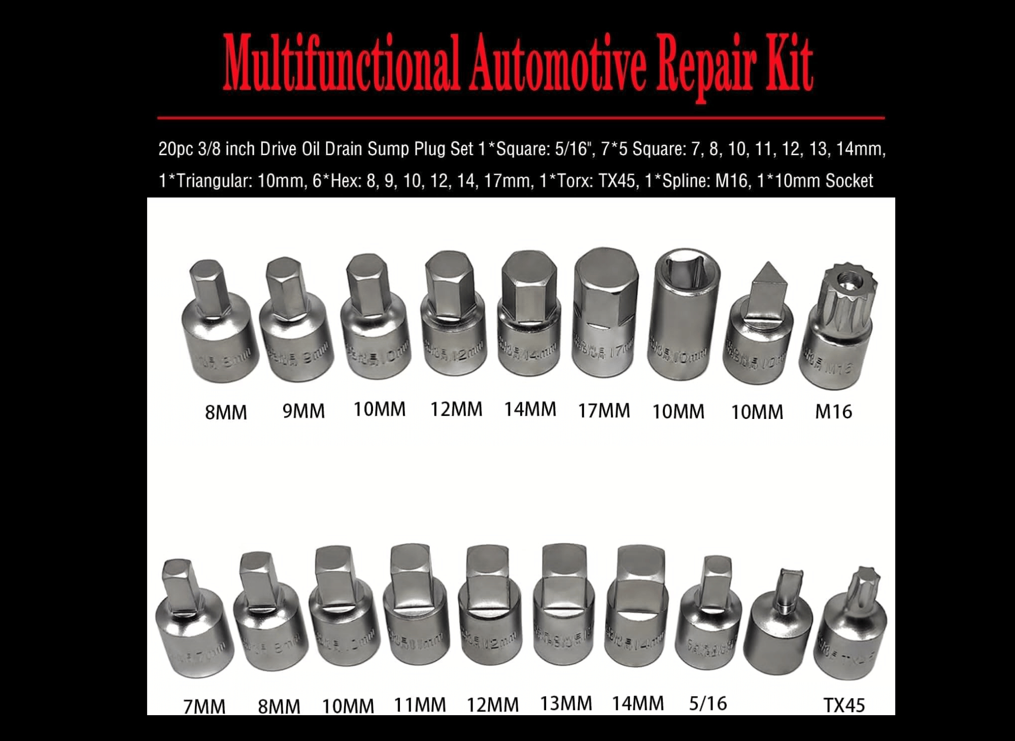 20PCS 3/8" Drive Oil Drain Sump Plug Key Set, Gearbox Hex Square Triangle Torx Spline Socket Set, Engine Repair Mechanic tool