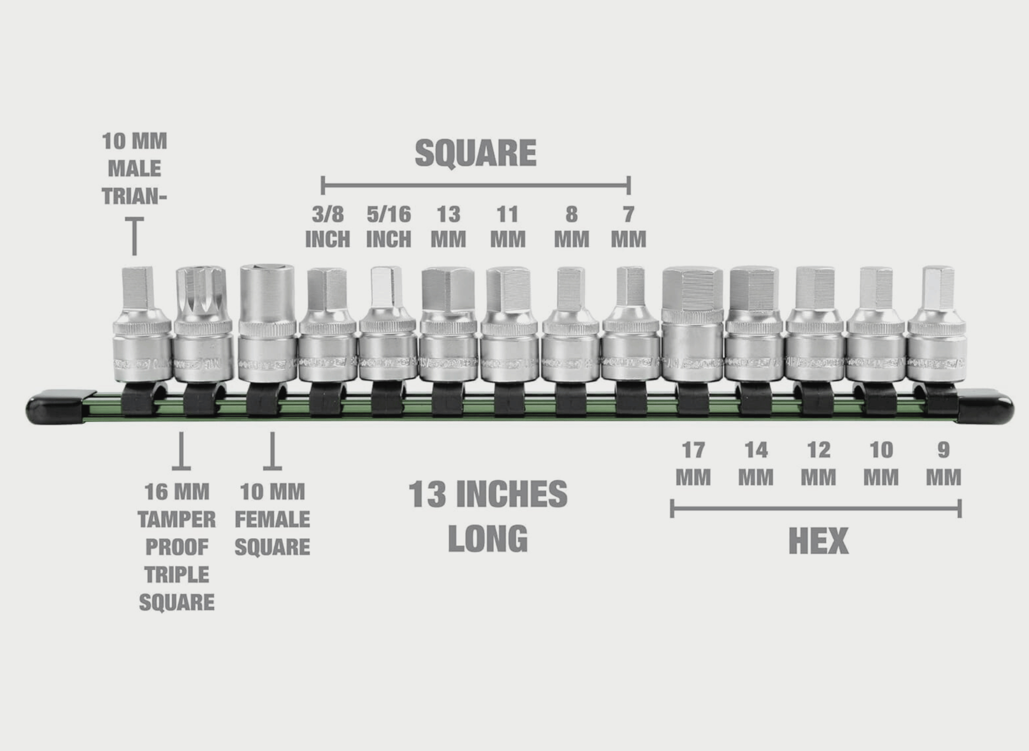 Hex sockets for traditional six-sided plugs ranging from 8mm to 17mm