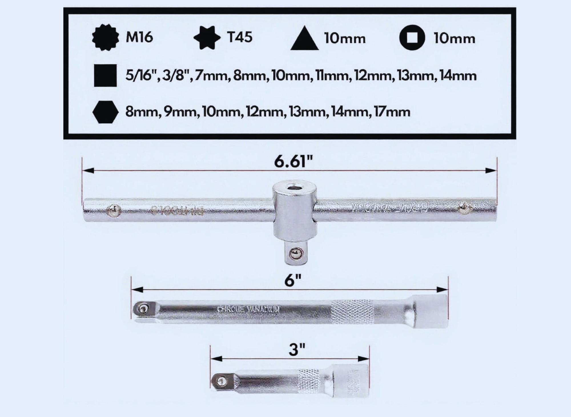 Chrome vanadium steel construction with chrome plating provides professional-grade durability at a competitive price point. The included sliding T-bar provides leverage when needed, while the 3-inch and 6-inch extension bars address access challenges in cramped engine bays.