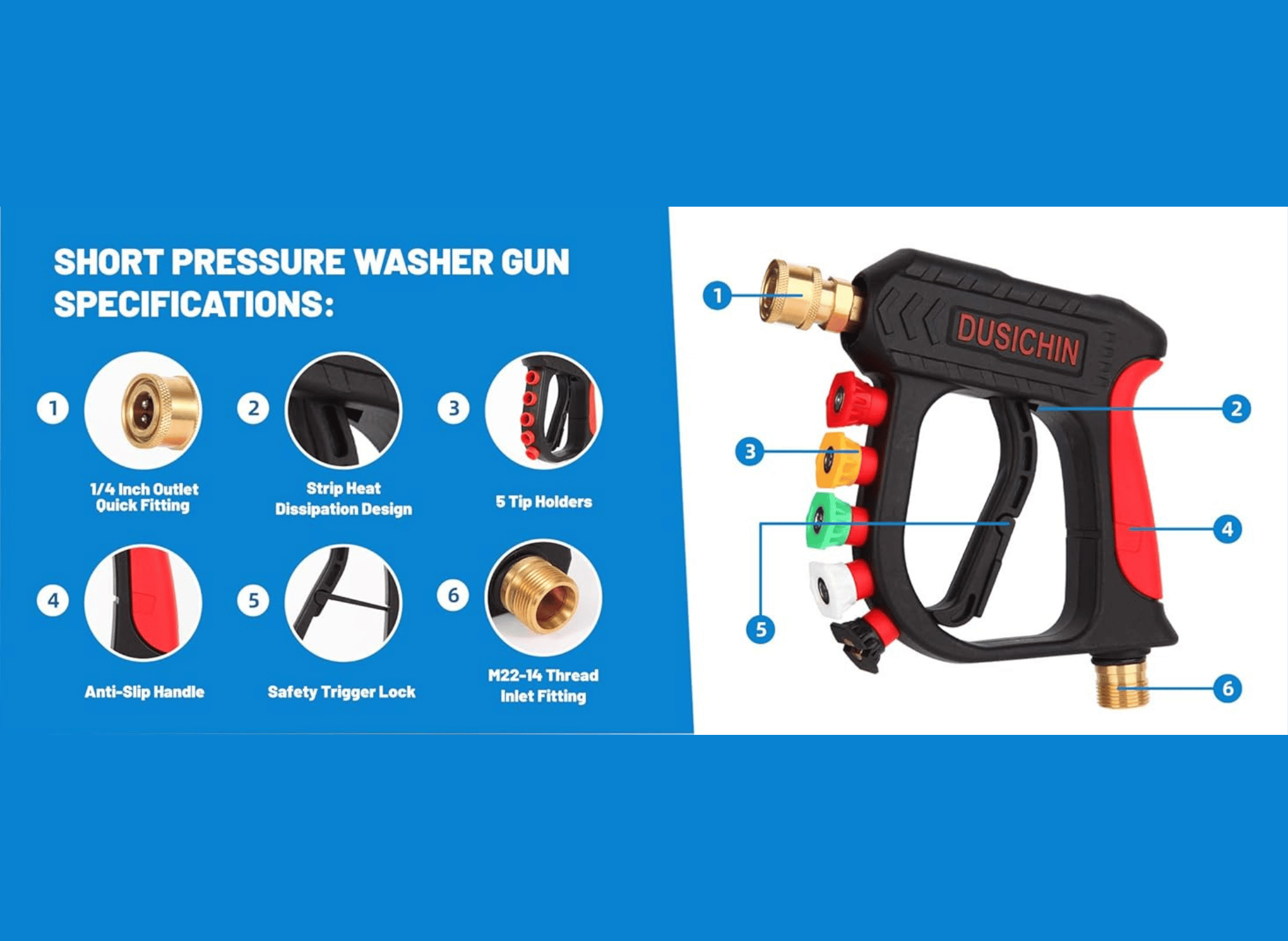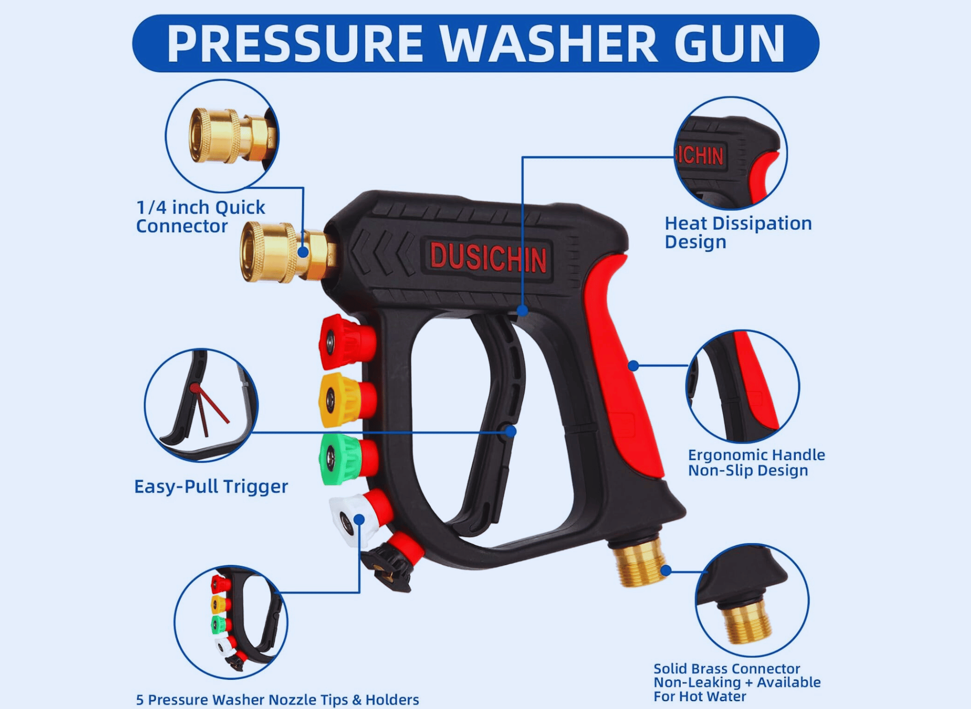The DUSICHIN Foam Cannon Short Pressure Washer Gun isn’t just a tool—it’s a cleaning upgrade. Its thoughtful design, variety of nozzles, and durable materials bring efficiency, convenience, and professional-level results to your cleaning routine. Whether you’re washing your car, driveway, or outdoor furniture, this versatile tool simplifies the process and enhances the outcome.