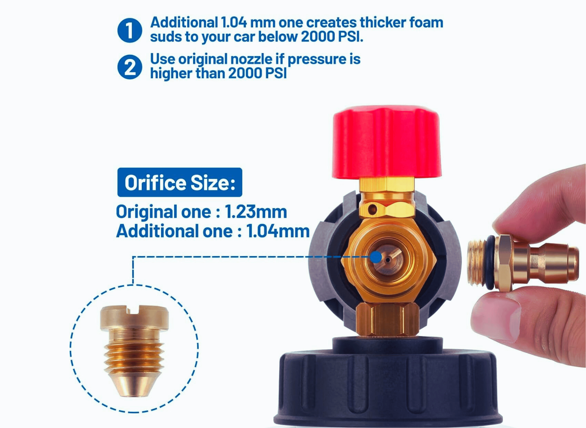 For lower-pressure setups (below 2000 PSI), you can easily switch to the additional 1.04mm orifice nozzle to achieve maximum foam density. Do you have a higher PSI pressure washer? Stick with the original nozzle for optimal performance.