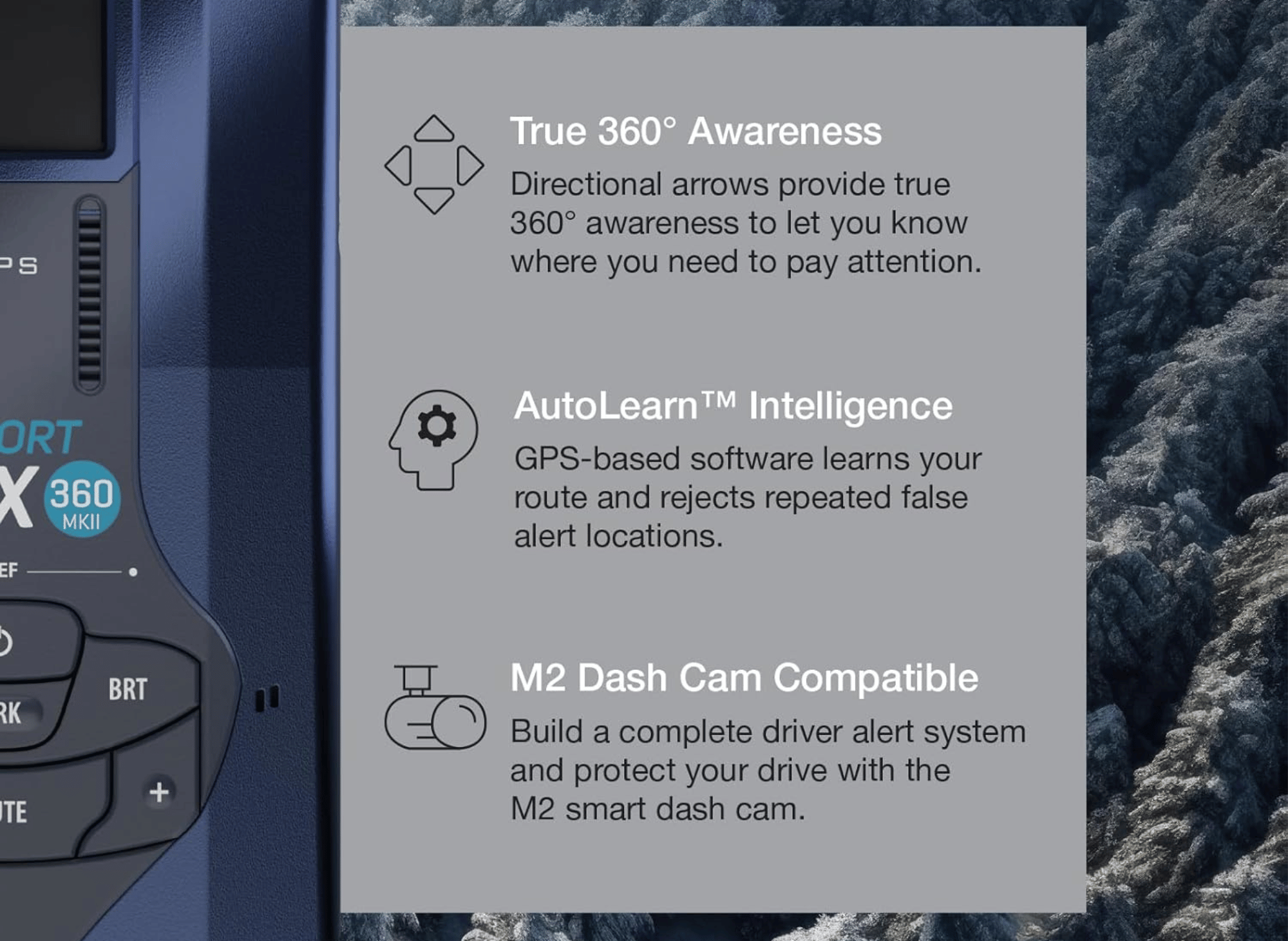 - AutoLearn Intelligence: As mentioned, the device learns to reject false alerts from fixed locations along your regular routes.