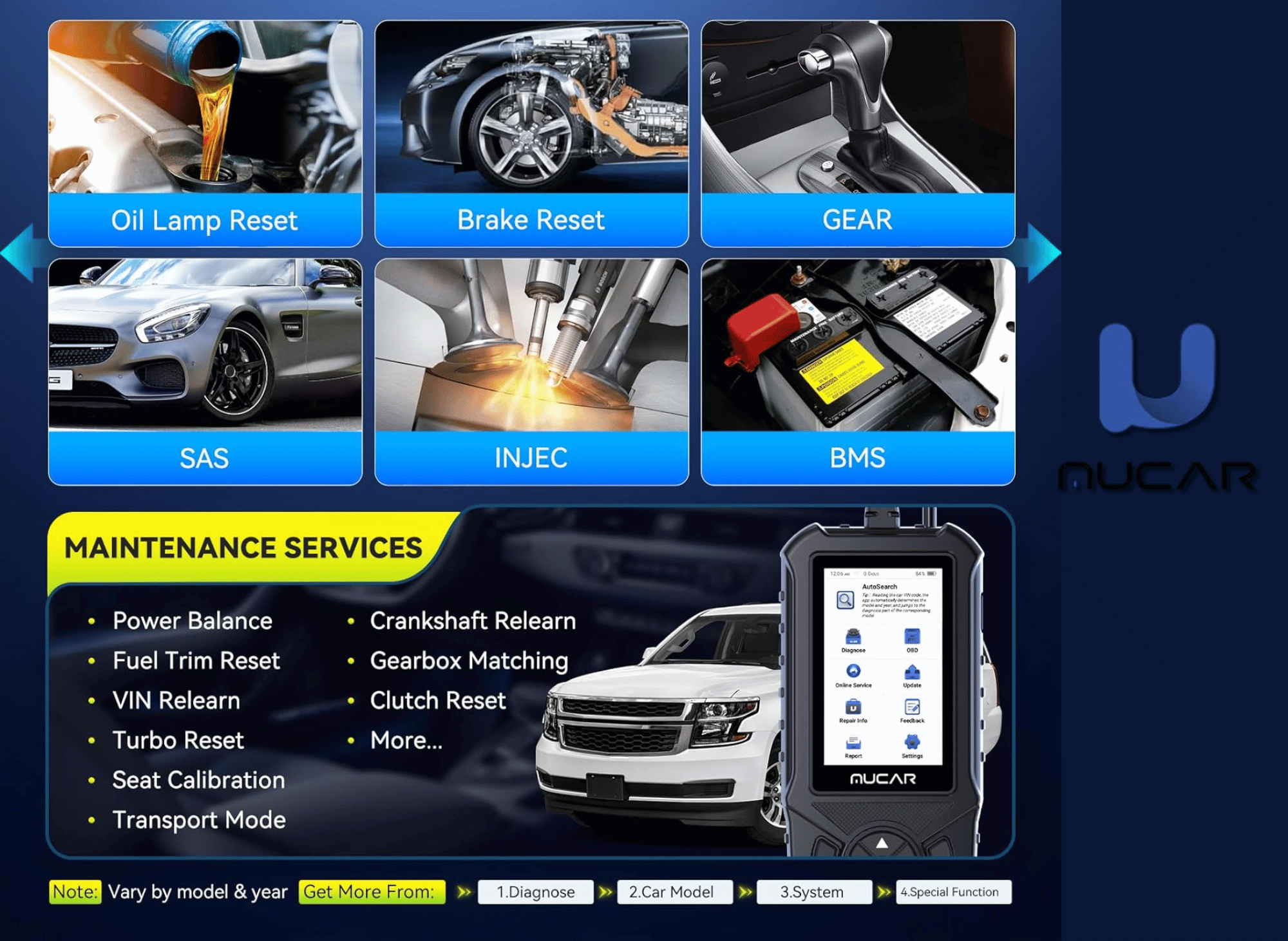 The MUCAR CDE900S includes all the standard special service functions that Ford owners commonly need. These include ABS bleeding, SAS (Steering Angle Sensor) reset, oil reset, power balance, transmission adaptation, injector coding, and suspension services.