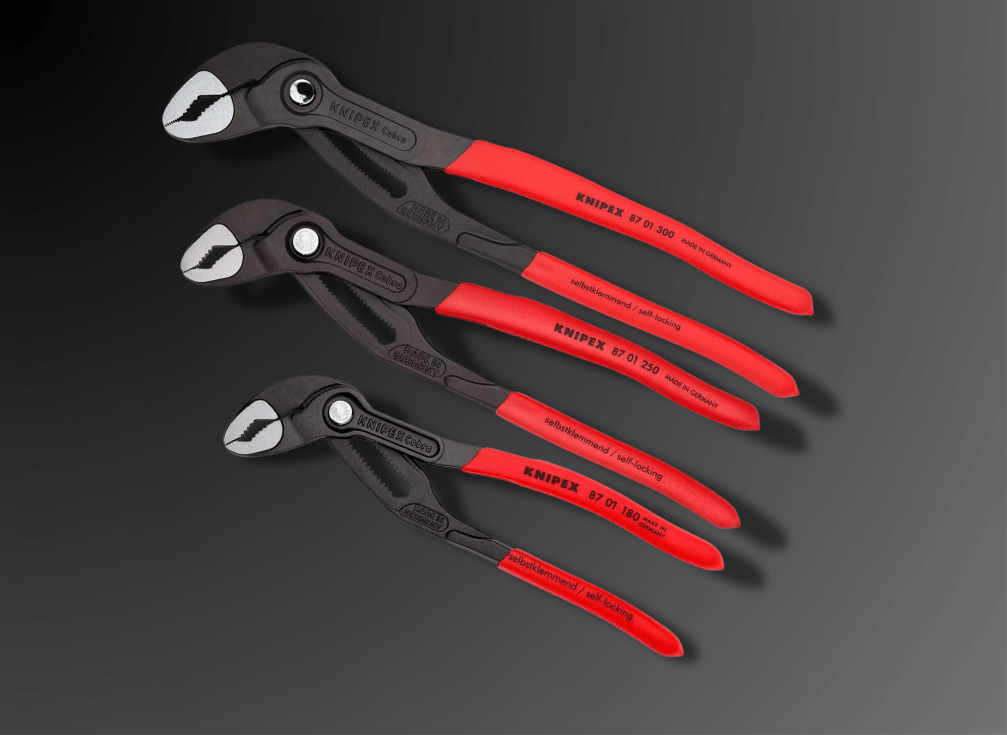 Set includes three (3) Cobra Water Pump Pliers: 87 01 180 (7 1/4"), 87 01 250 (10"), and 87 01 300 (12").