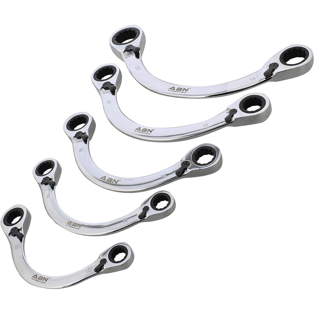 This ABN 5-Piece Metric Ratcheting Wrench Set features 12-point double end wrenches heads that encase fasteners with hex, jam, cap, and square heads. The box end wrench set includes 10 and 12mm, 11 and 13mm, 14 and 16mm, 15 and 17mm, and 19 and 22mm wrenches. The lever on the ratchet box wrench set allows you to switch between tightening and loosening with a finger without letting go of tool set wrenches.