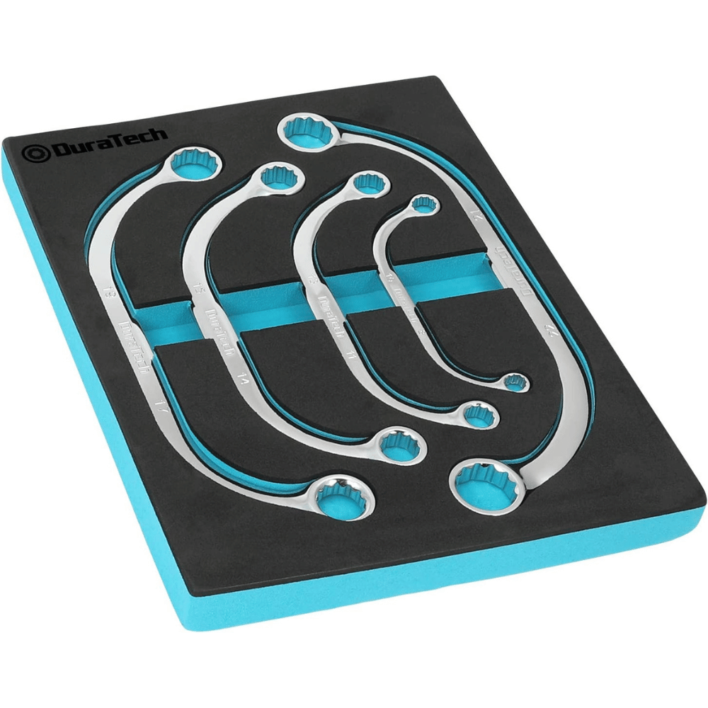 The Duratech Half Moon Box Wrench Set offers an easy and efficient application for the fastener. The double 12-point box end geometry is designed to grip the flat sides of fastener heads, not corners, to prevent round-off, increase the contact area, and lock the groove. This set includes two sizes per wrench for more options with less to carry. The wrench sizes are stamped twice on both sides of the handle for easier size identification.