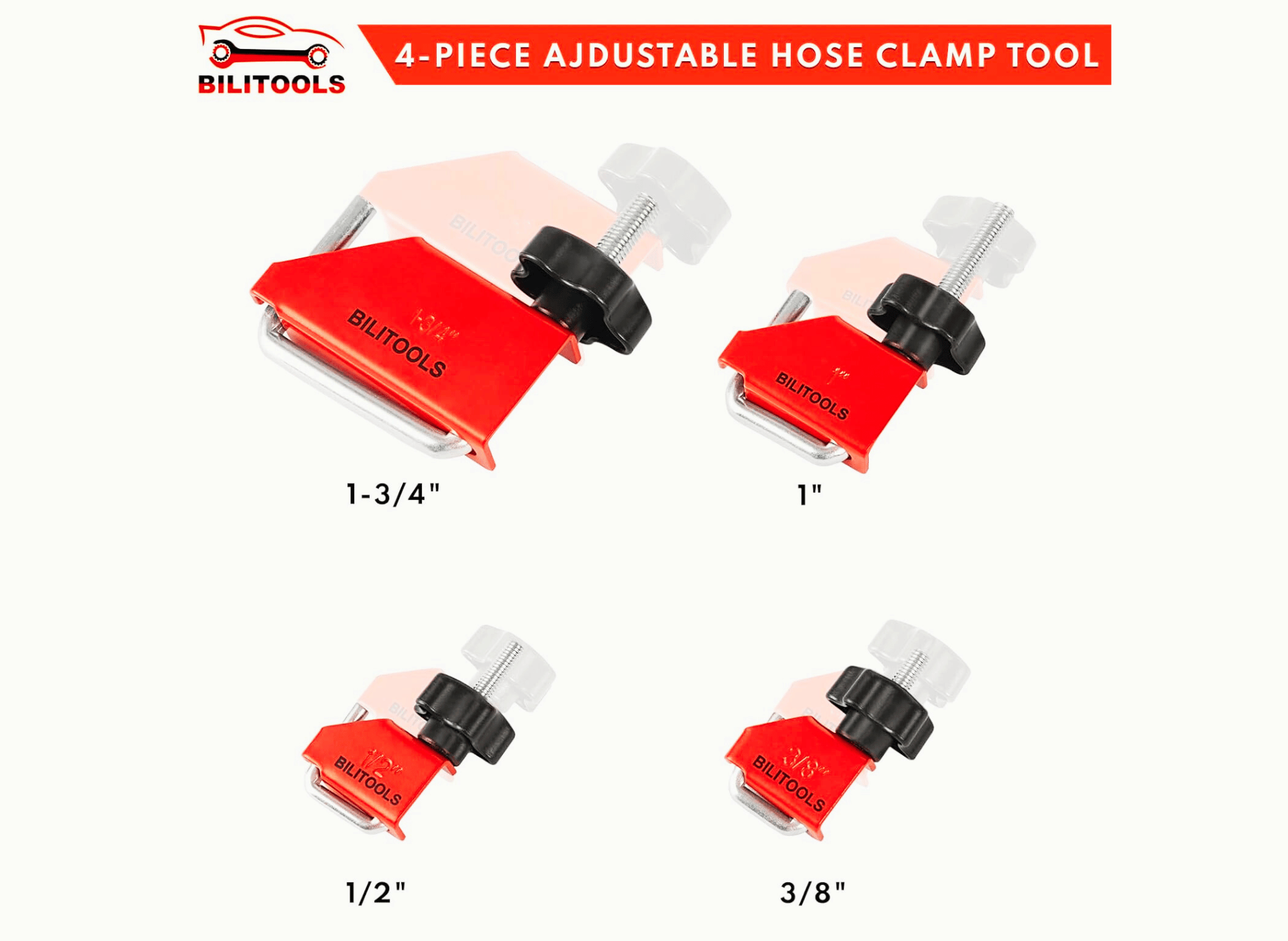 The set includes four red clamps in different sizes: 3/8”, 1/2”, 1”, and 1-3/4”. This range of sizes ensures you have the right tool for various jobs, from small vacuum lines to larger radiator hoses. Having multiple sizes on hand means you can select the perfect clamp for the task, ensuring a secure fit without over-stressing the hose or any other parts.