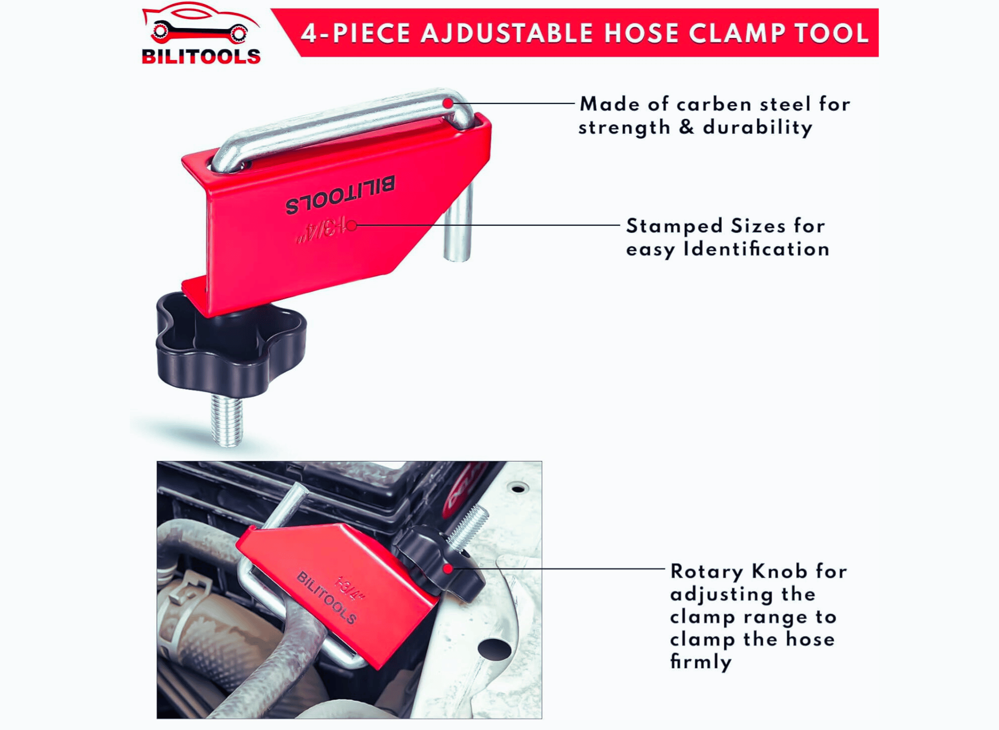 The BILITOOLS set is designed to provide a quick and straightforward solution for clamping various types of flexible automotive hoses. This includes fuel lines, coolant and radiator hoses, brake lines, vacuum lines, and hoses in the fuel system. The primary purpose of these pliers is to stop fluid flow without causing any damage to the hose itself, which is crucial for maintaining the integrity of these essential parts.