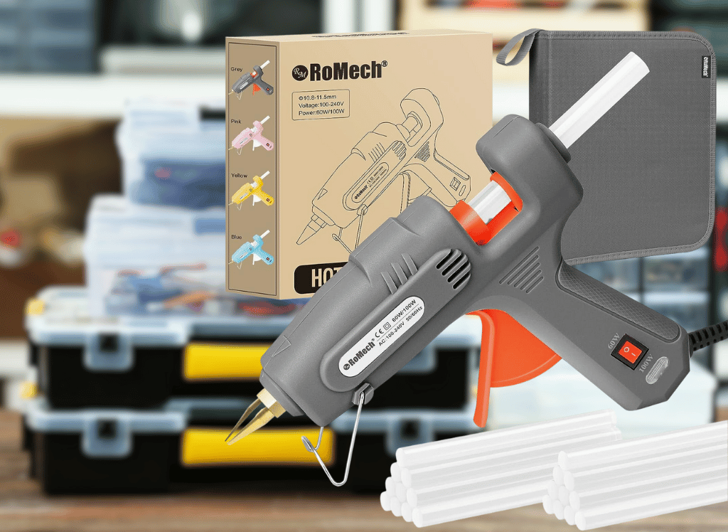 The ROMECH Full-Size Hot Glue Gun is an excellent tool for hobbyists, crafters, and DIYers. It is a durable and reliable product with a drip-free brass nozzle. The glue gun kit includes 21 high viscous, odor-free hot glue sticks and a premium Oxford carry/storage case.