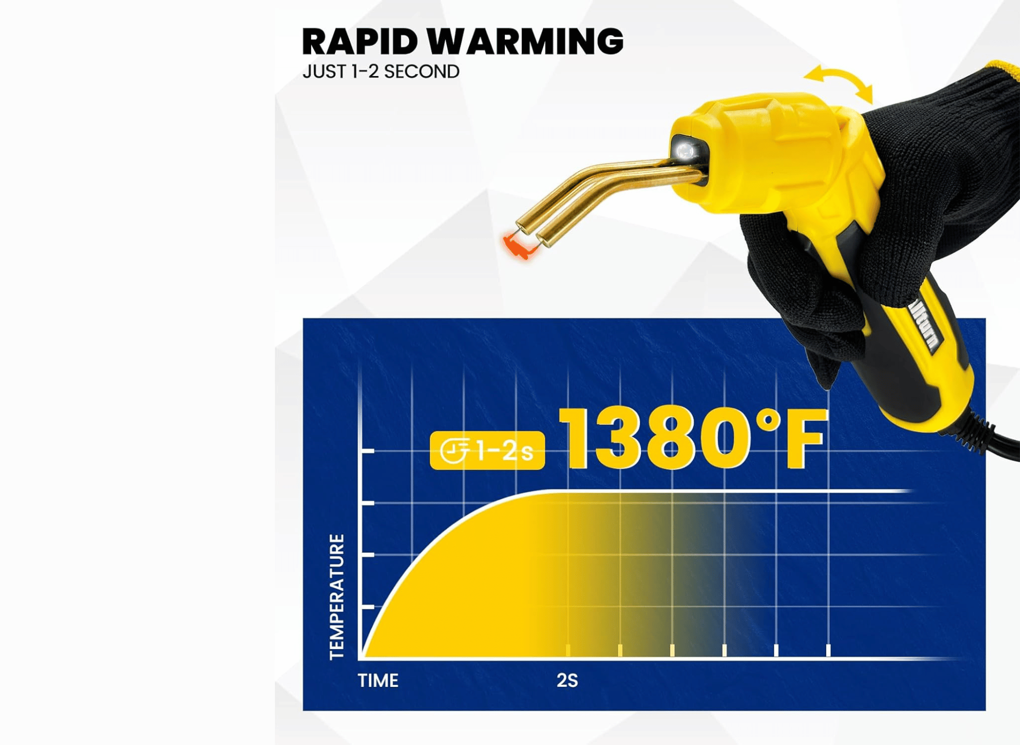 Safety is their top priority, so the Allturn Plastic Welder is equipped with internal overheating protection. This feature ensures electricity safety by stopping the gun from working when it overheats and allowing you to resume use once it cools down. Additionally, this welding gun boasts a patented appearance (Patent Number D970324) for added distinctiveness and fashion-forward features.