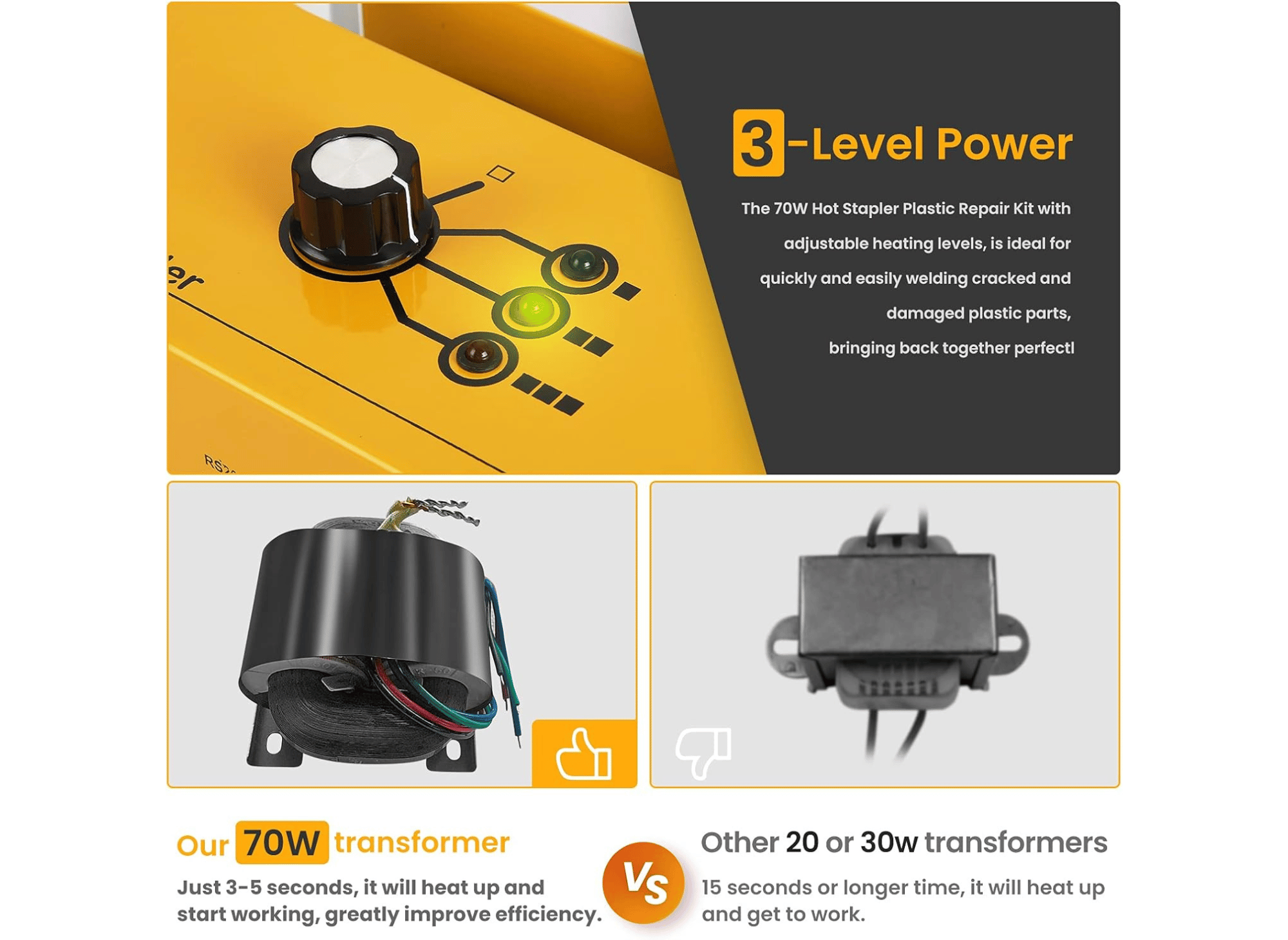 Perfect for automotive, power sports, hobby, and industrial applications, this kit comes with three staple-mounting options and three staple types that are 1/2 inch wide each. With three heat settings, you can easily adjust the temperature to suit various repair needs.
