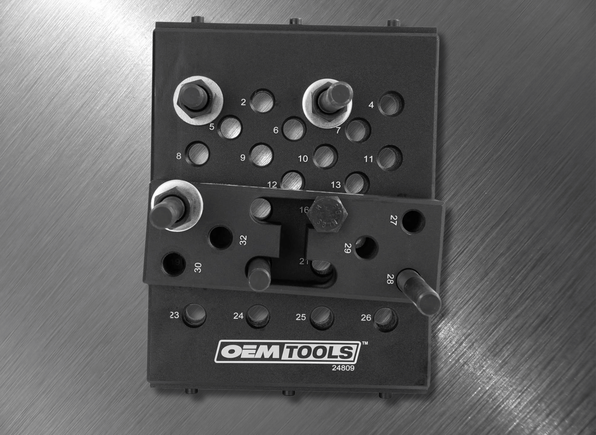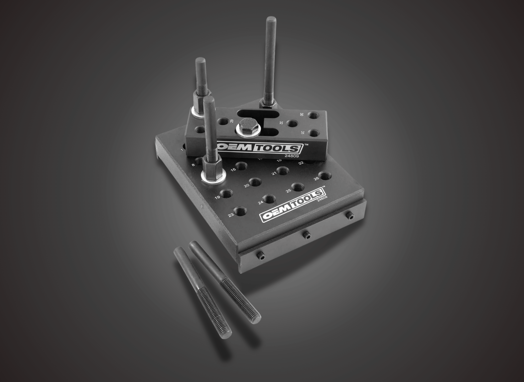 The press support block plate tool set kit consists of multiple pieces that work together to hold and support different areas of the engine during repair or maintenance. It comes with adjustable brackets, bolts, plates, clamps, etc., that can be configured according to the job's specific needs.
