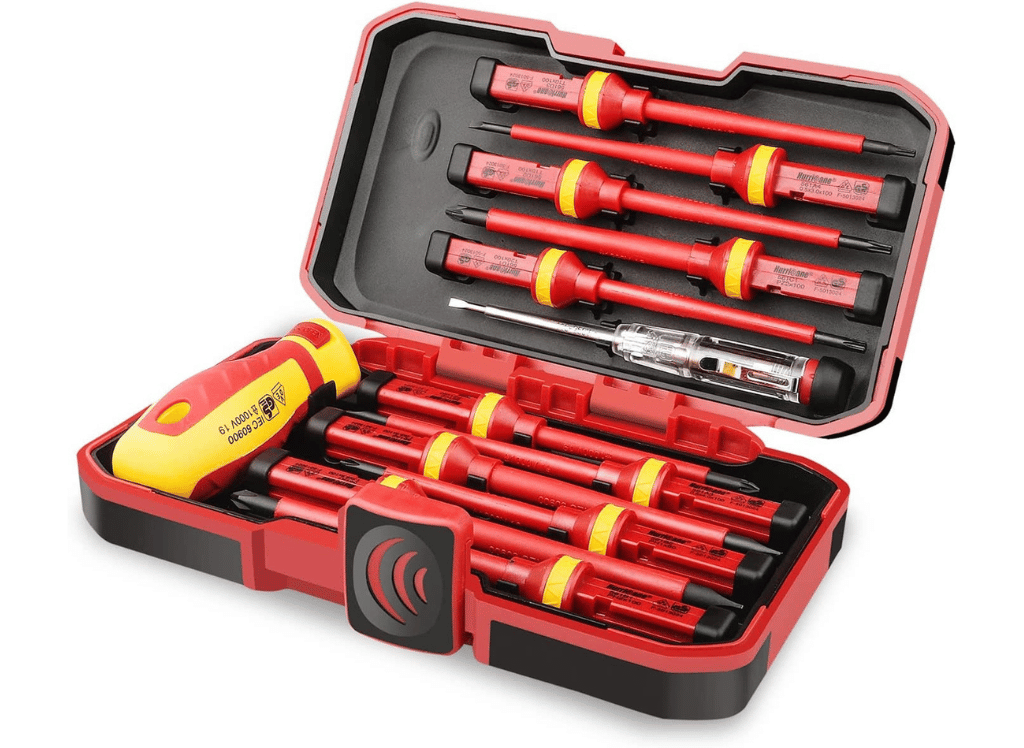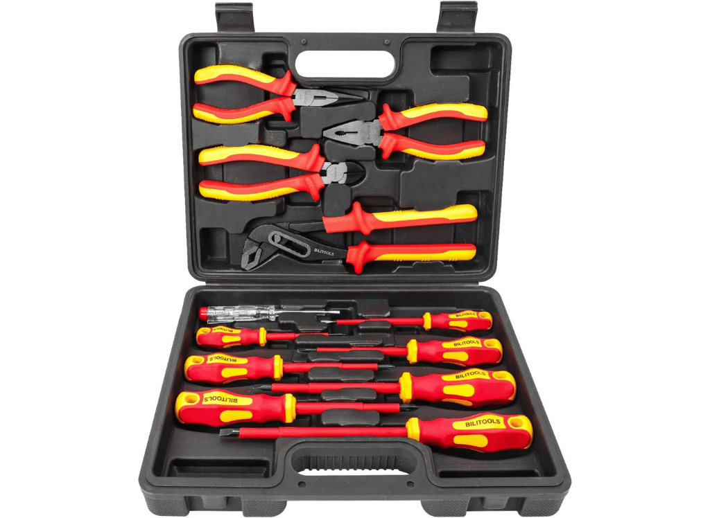 BILITOOLS 1000V Insulated Screwdriver & Pliers Set is the perfect tool for electricians. It includes a variety of screwdrivers and pliers that are insulated and certified to withstand up to 1000 volts. Plus, the ergonomic handles make it easy and comfortable to use.