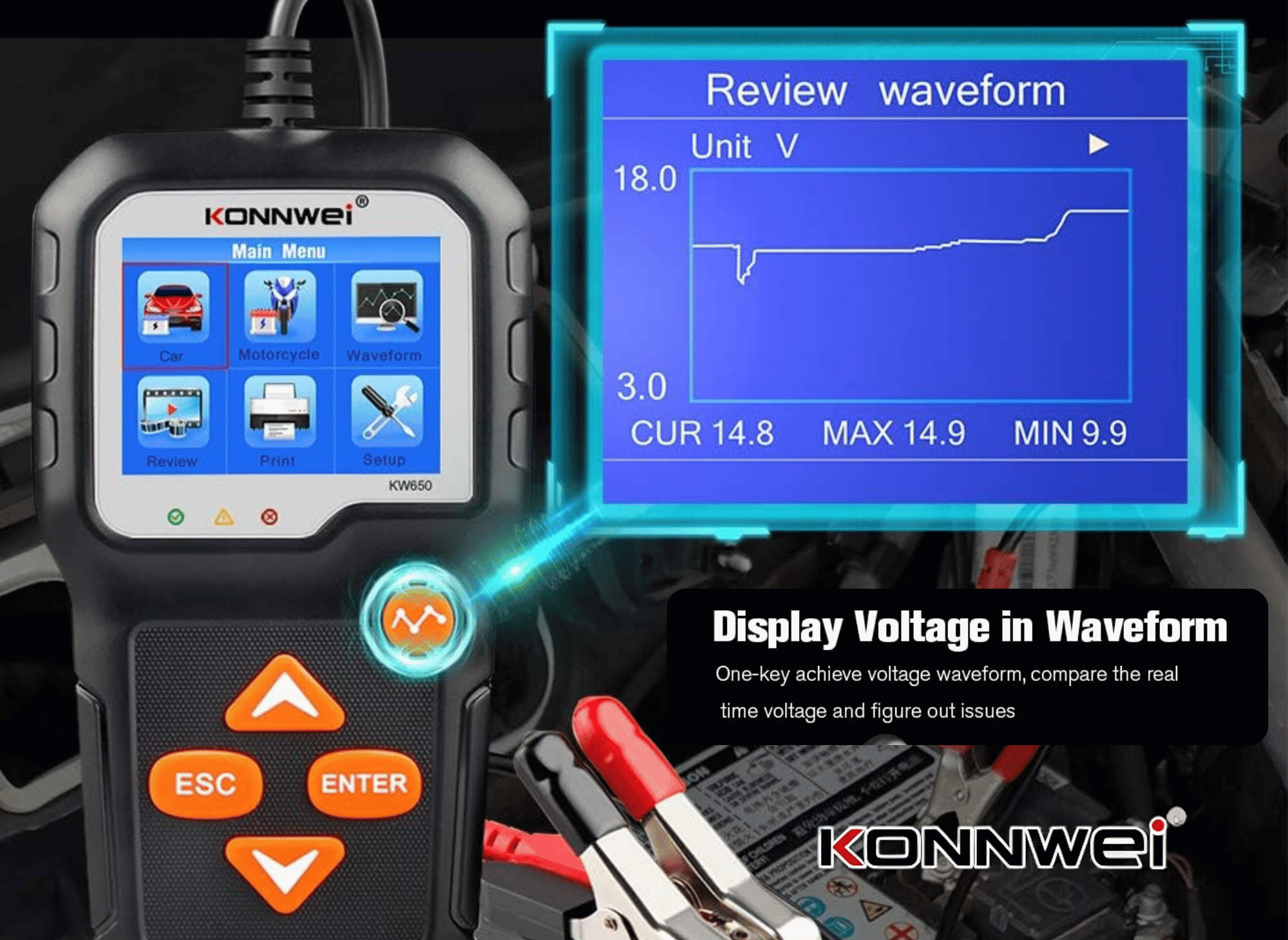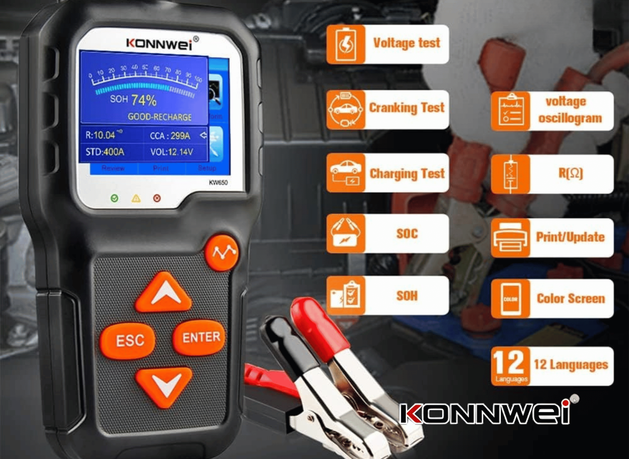 A reliable car battery tester is a crucial tool for vehicle maintenance. By diagnosing potential battery problems before they turn into full failures, you can extend the lifespan of your car battery and avoid expensive roadside assistance services. The KONNWEI KW650 is designed to check your battery’s overall health, charging capabilities, starter performance, and more.