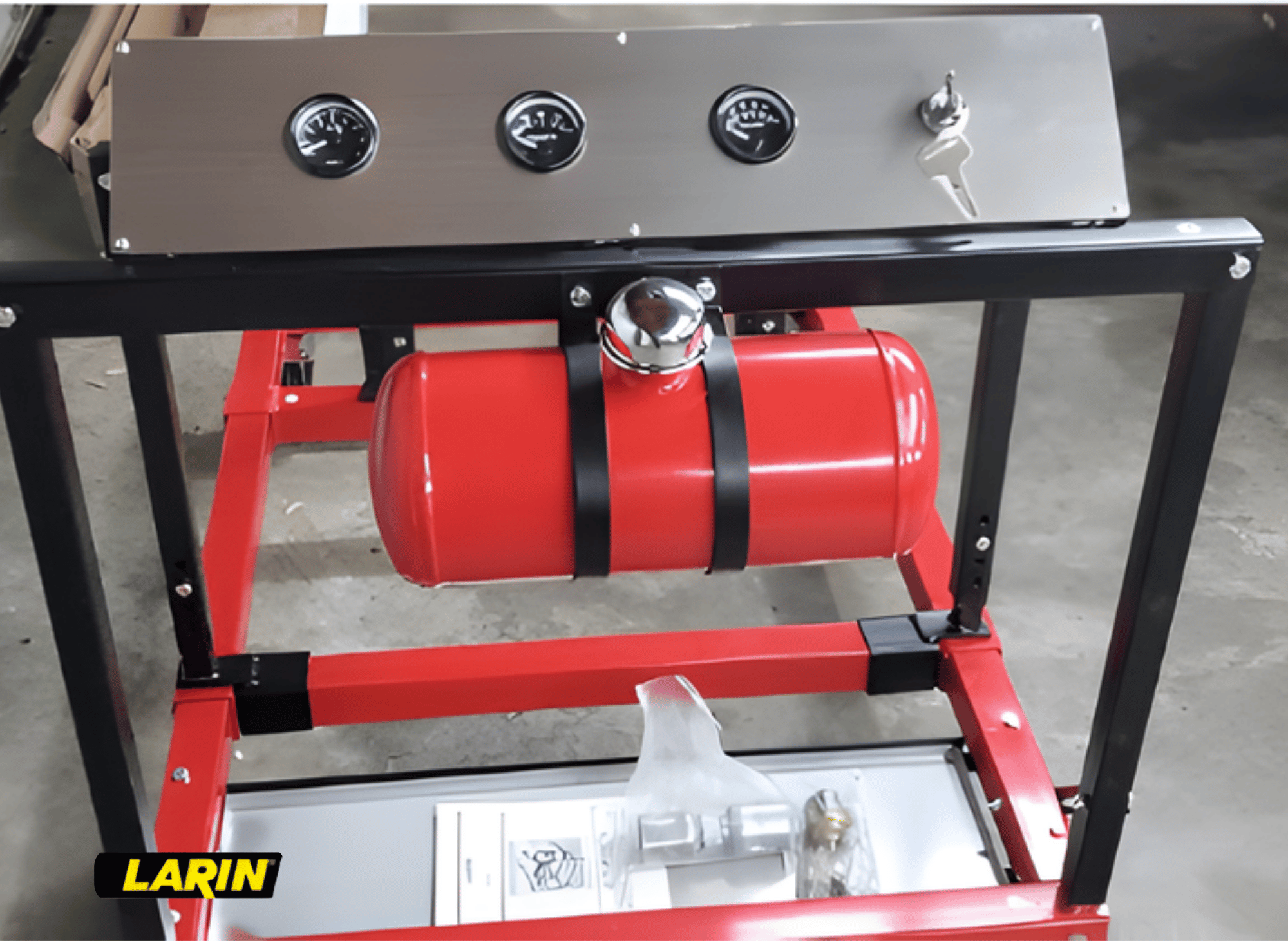 What sets the METS-1 apart from a DIY welded stand is the integrated console. It comes pre-equipped with the essential gauges you need to monitor engine health during a break-in or test run. You don't need to rig up a separate dashboard; Larin has built it right into the unit.