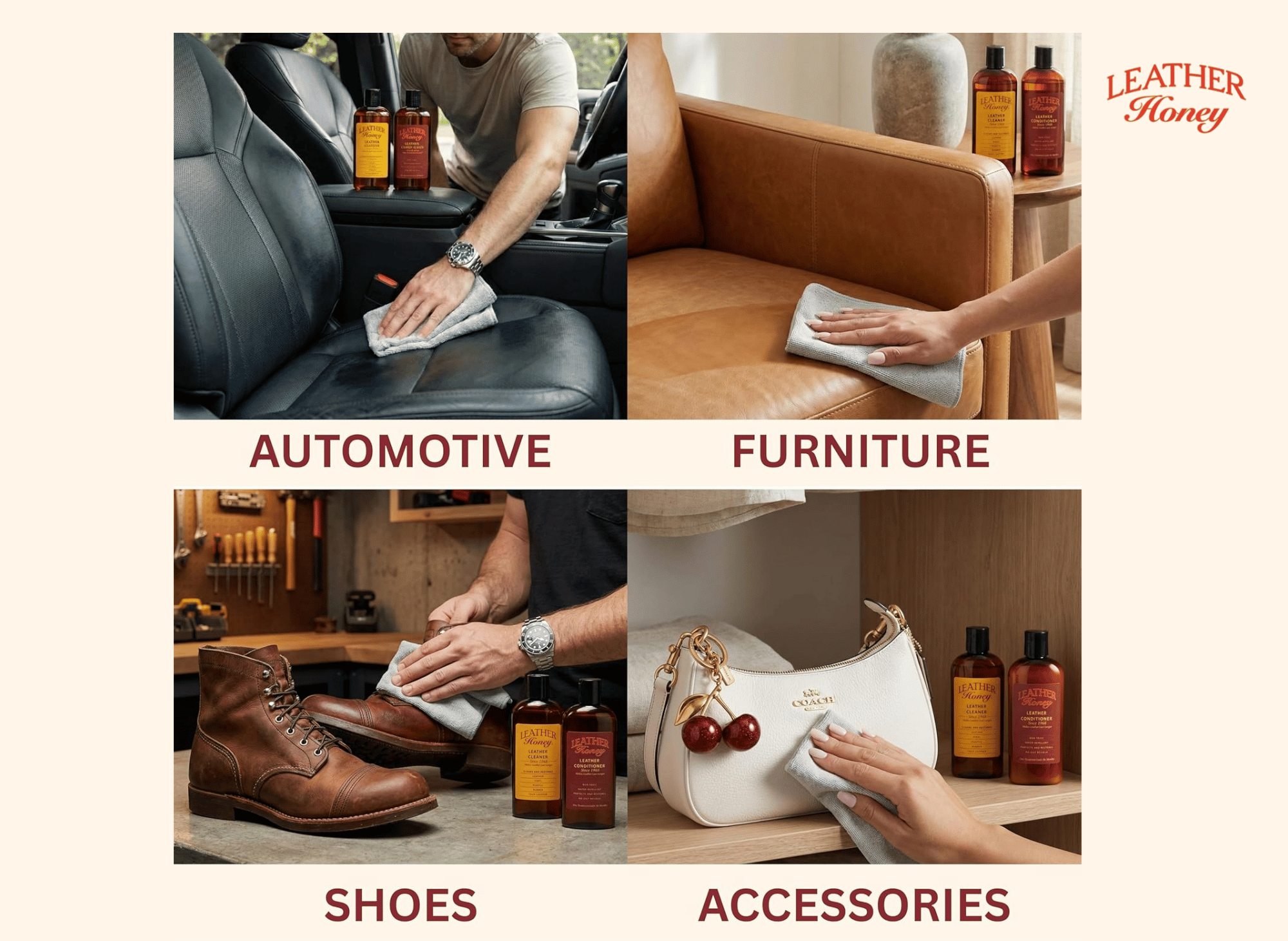 One of the biggest advantages of Leather Honey is its versatility. A single 8-oz bottle covers fine leather products ranging across nearly every category of leather care, including furniture. wallets, handbags, boots, jackets, and more. Leather Honey is suitable for a wide variety of materials, including leather apparel, furniture, car seats, saddlery, and boots.