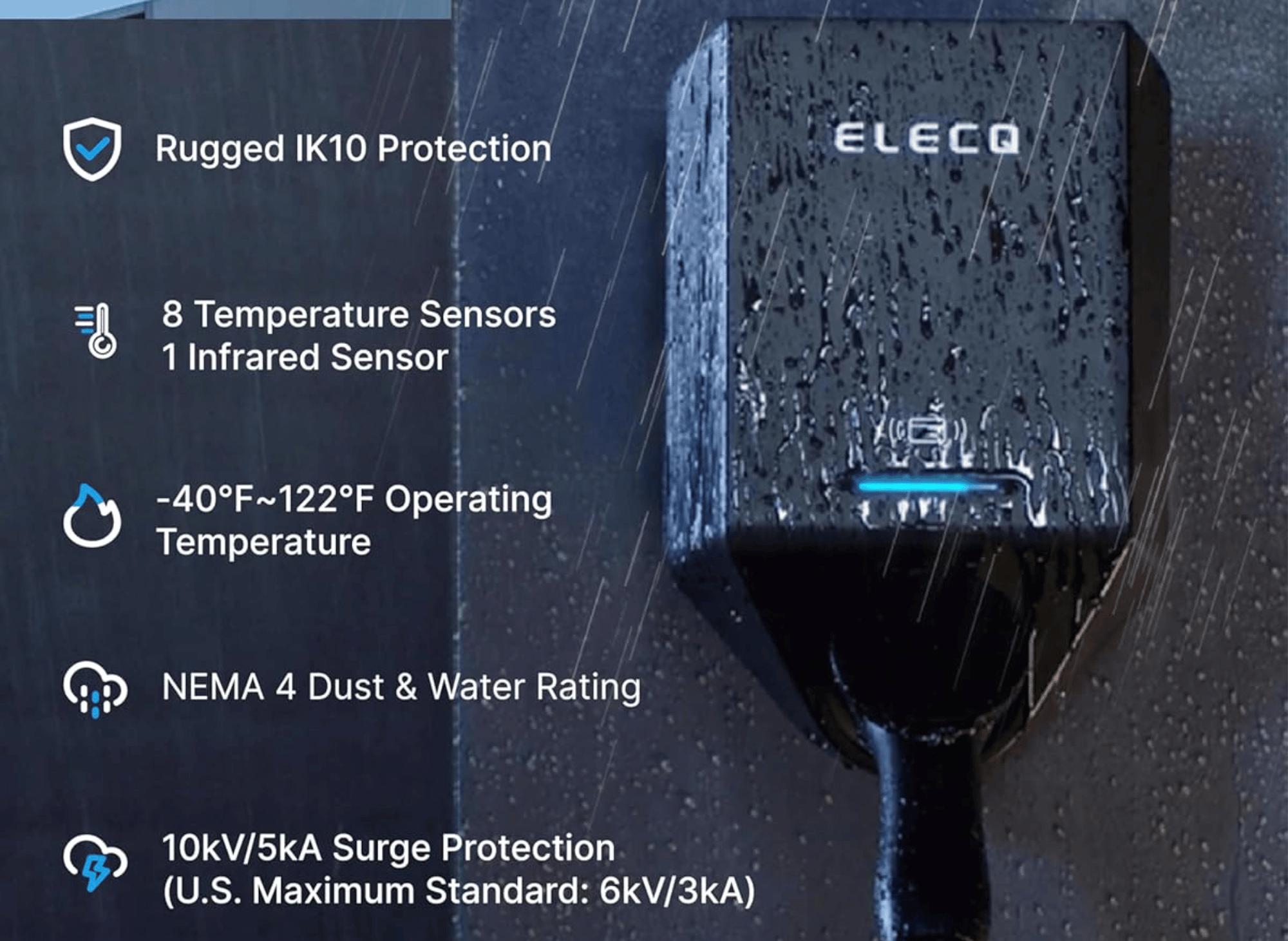 NEMA weatherproof ratings indicate how well the charger withstands outdoor conditions. NEMA 4 rating protects against wind-driven rain and splashing water, making it suitable for garage installations. NEMA 4X adds corrosion resistance for coastal areas or harsh climates.